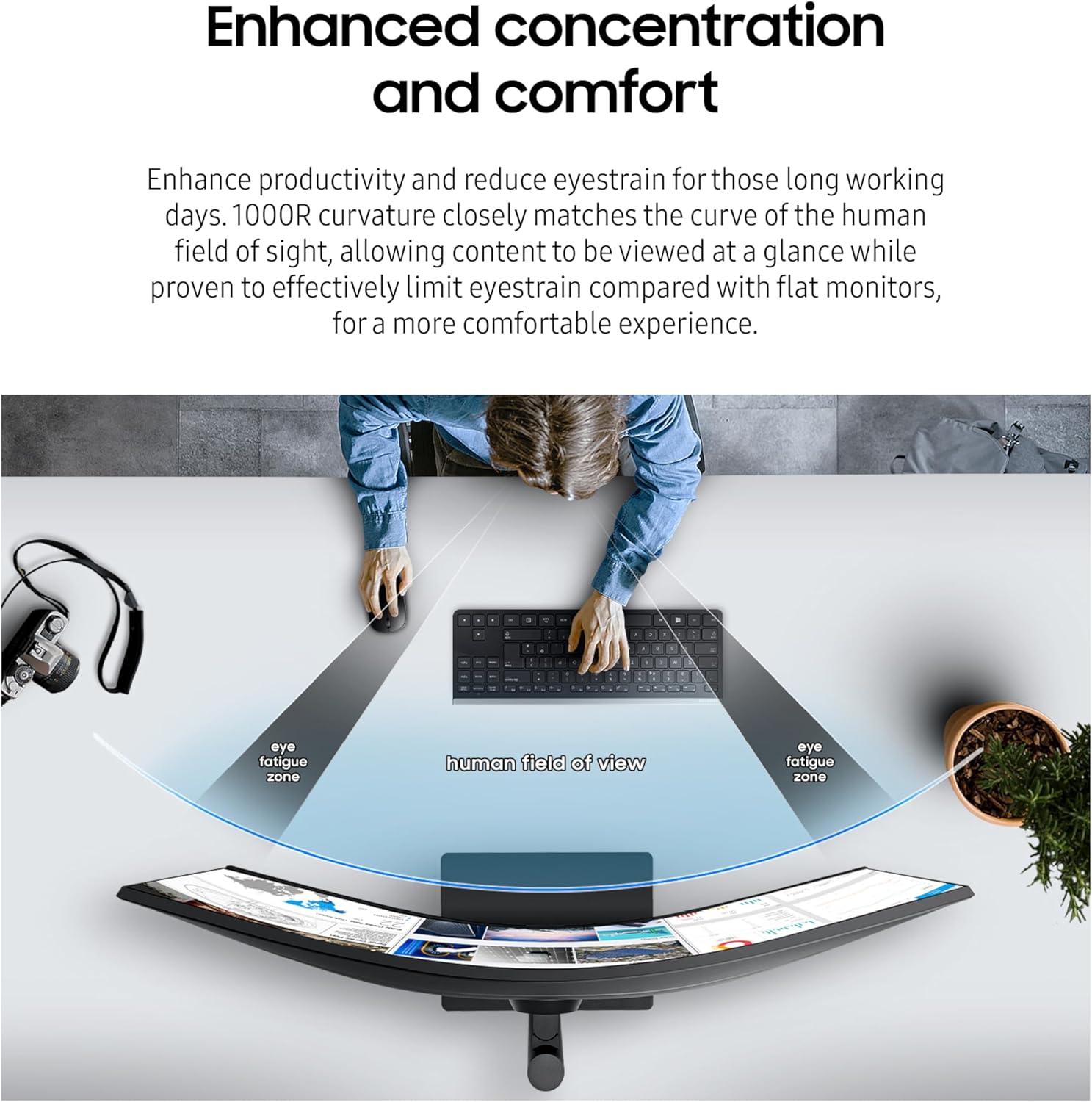 Improved concentration and comfort: maximize labor productivity and reduce visual fatigue; The 1000R curvature coincides with the human view field and limits the visual fatigue experienced with flat monitors