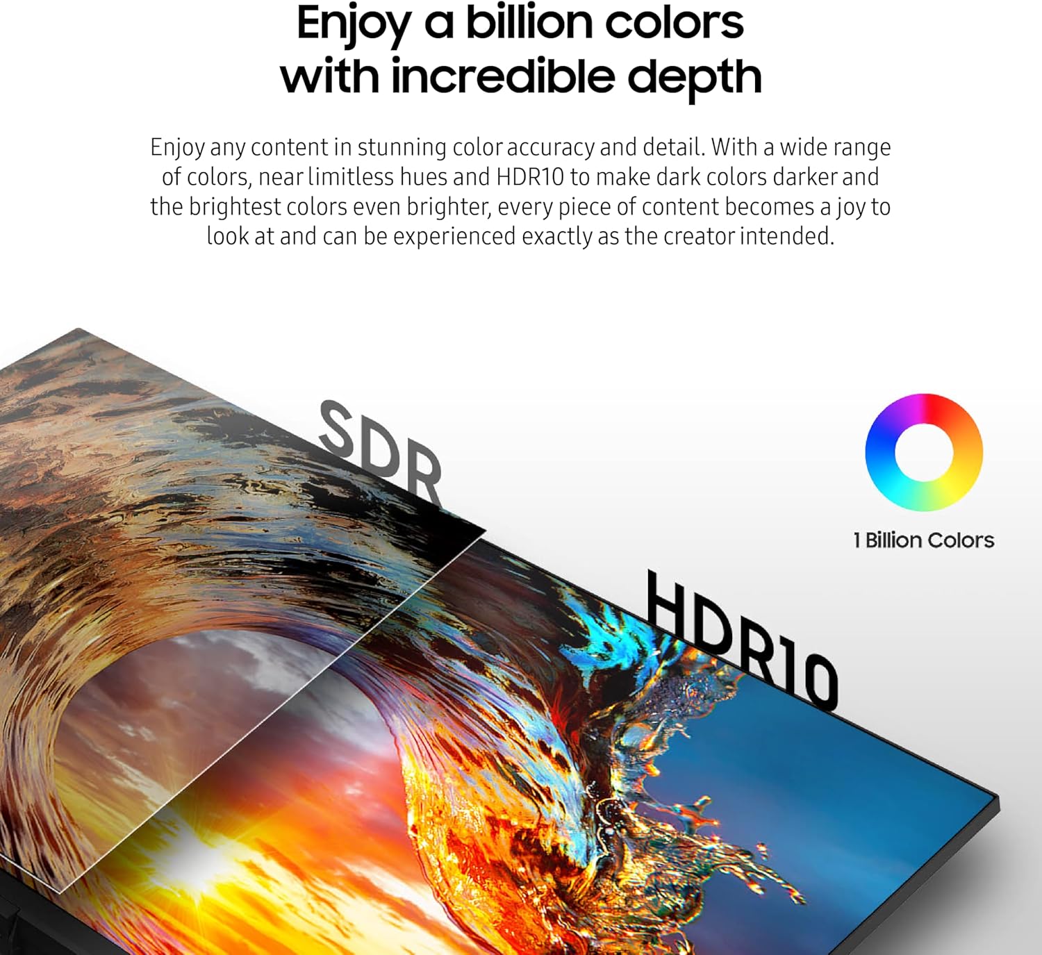 1 billion colors with HDR10: With a wide range of colors, almost unlimited tones and HDR10, which makes dark colors darker and the brightest colors even brighter, the content is a pleasure to see