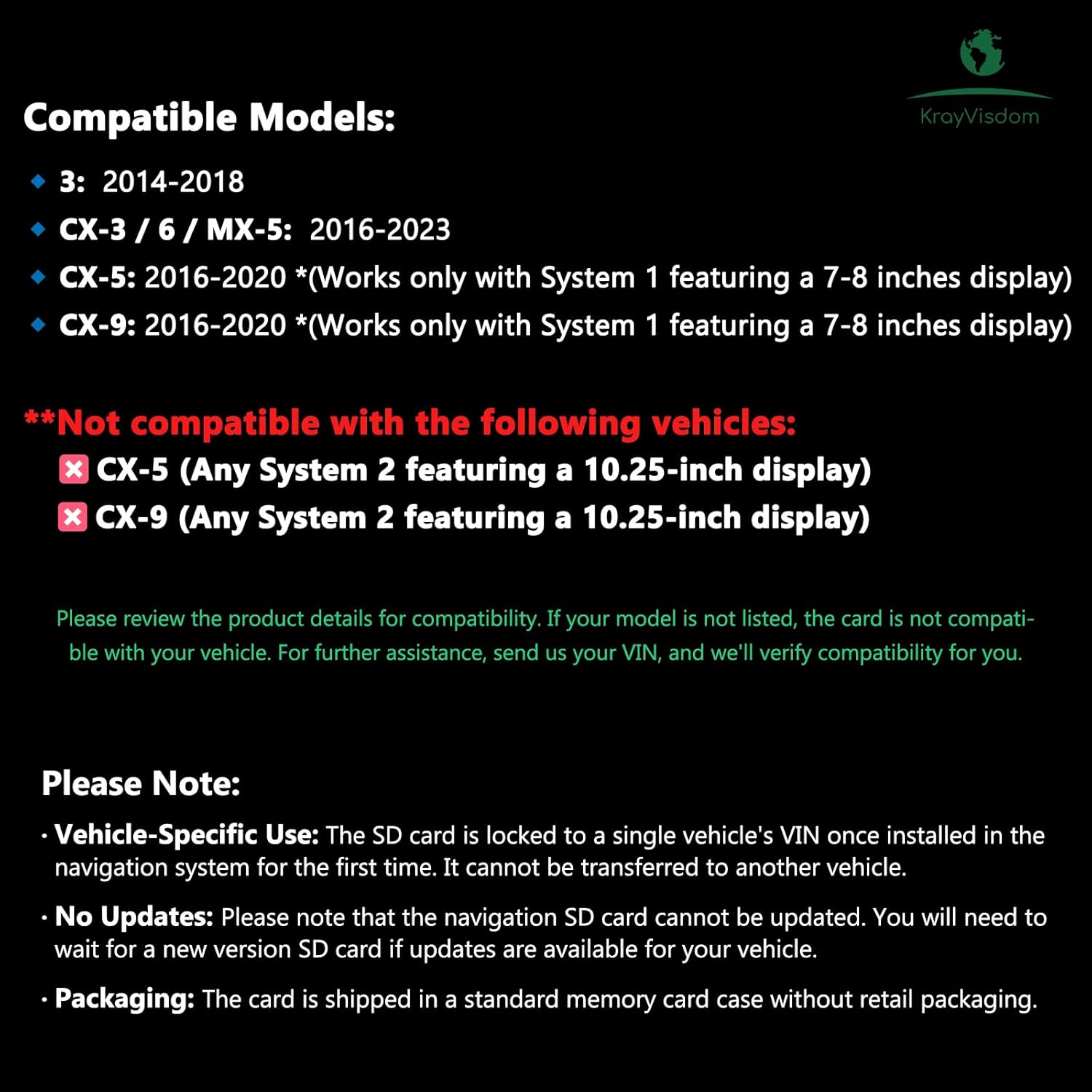 Specific vehicle use: The SD card is blocked in the single vehicle vin once installed in the navigation system for the first time. It cannot be transferred to another vehicle. No updates: Note that the navigation SD card cannot be updated. You must wait a new version of the SD version if there are updates available for your vehicle. Dairy: The card is sent in a standard memory card box without retail containers. Installation: Make sure the card is inserted before starting the engine for adequate installation.