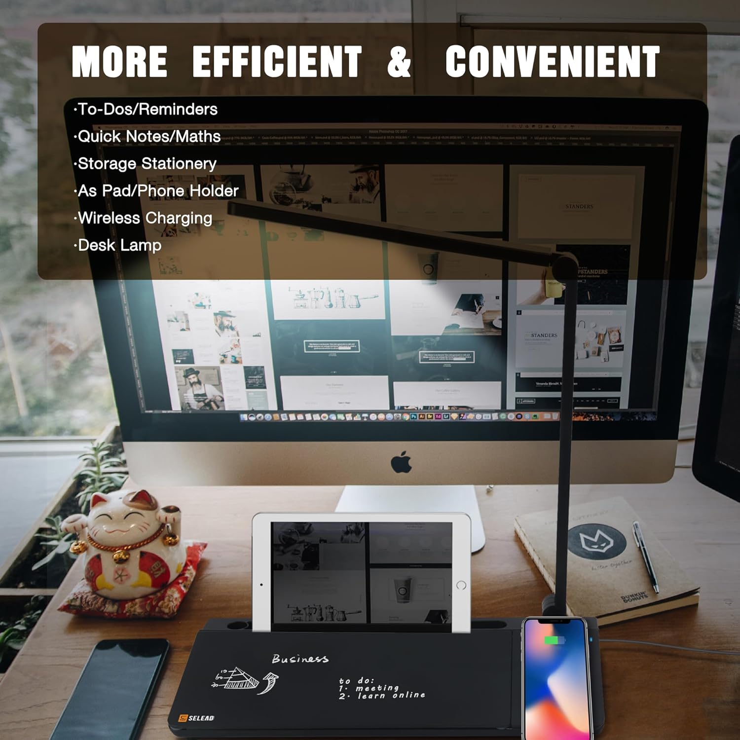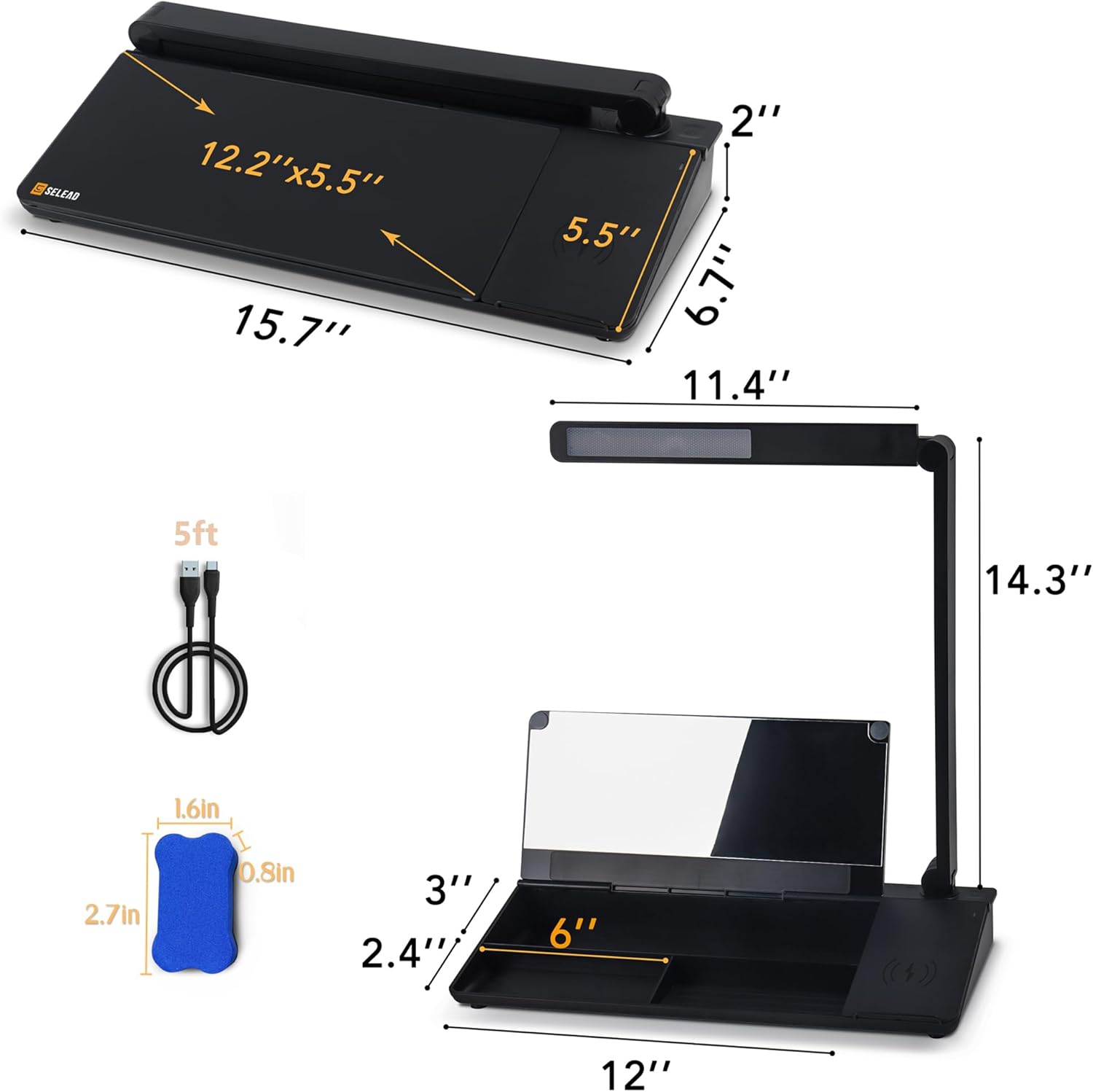 ✅ MULTIFUNCTIONAL: Storage, wireless charging, lighting, writing, mirror, iPad/iPhone stand, keyboard stand, our desktop whiteboard is an all-in-one multi-purpose whiteboard. Equipped with 1 adapter, 2 black dry erase markers, 1 eraser and 5ft USB Type-C cable, instructions.