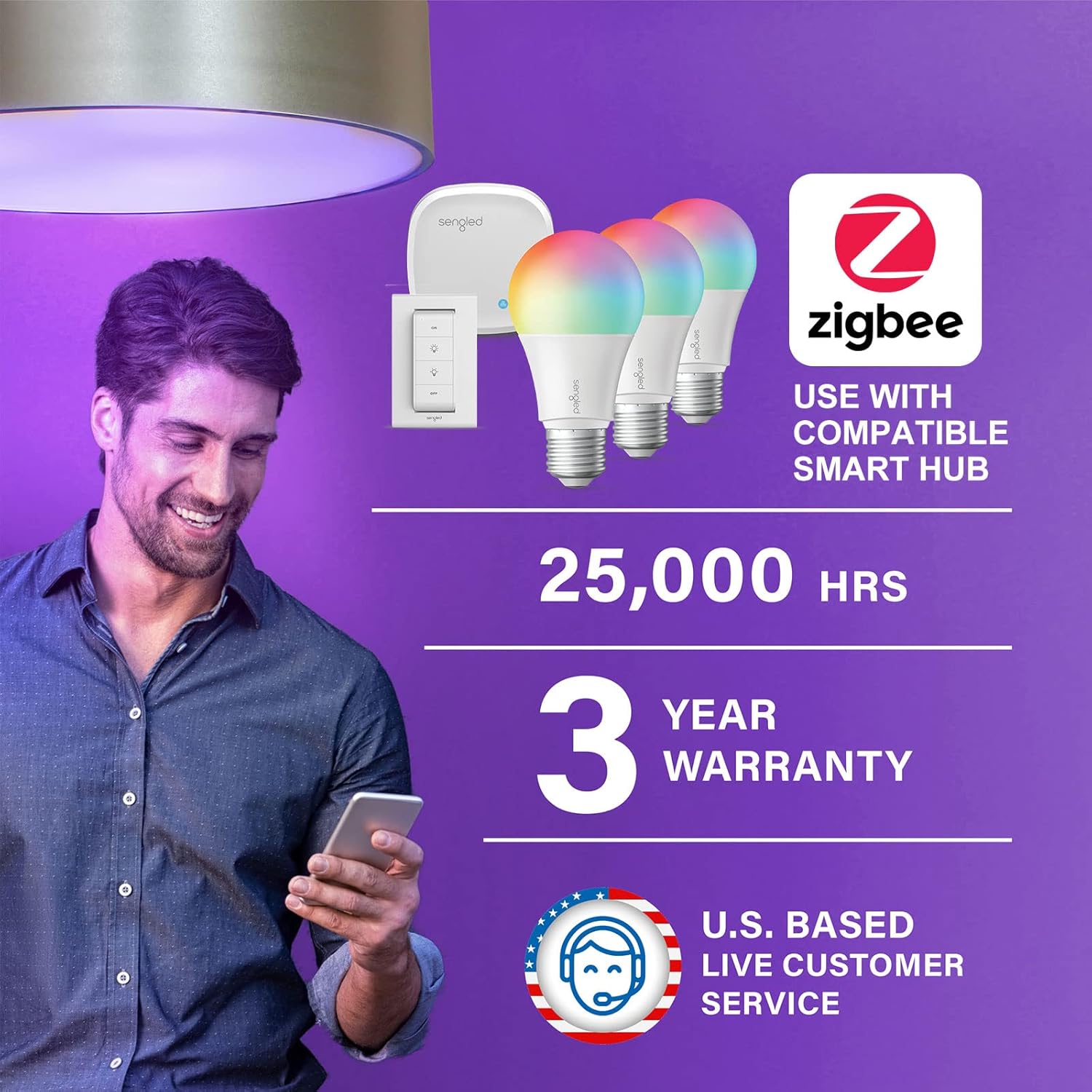 New in smart lighting Get started with easy smart lighting with this Sengled smart bulb. Just by using smart bulbs, with Segeld Hub, you can control up to 10 lights in 1 room. Comfortable on the couch? No need to get up to change the lights. Control your lights using the (free) Sengled Home app or just with your voice with Alexa or Google Assistant. Works with all Echo smart speakers/displays and Google Nest devices (Sengled Hub required for Echo (1st Gen) and Echo Dot (1st Gen). Want to upgrade your entire home with smart lighting. Add a Sengled Hub to Control up to 64 lights. Get access to Sengled's full capabilities (home and away control, timers/routines, plus smart home partners) and an expanded product portfolio (indoor and outdoor smart lighting and accessories). This bulb is also compatible with Sengled Hub, it is the smart lighting expert, offering you the most complete, up-to-date and secure smart lighting ecosystem.