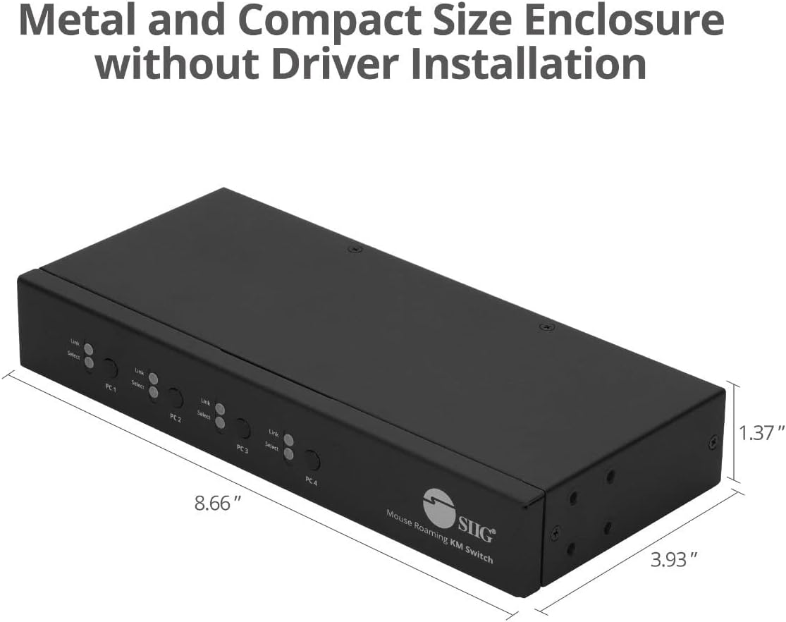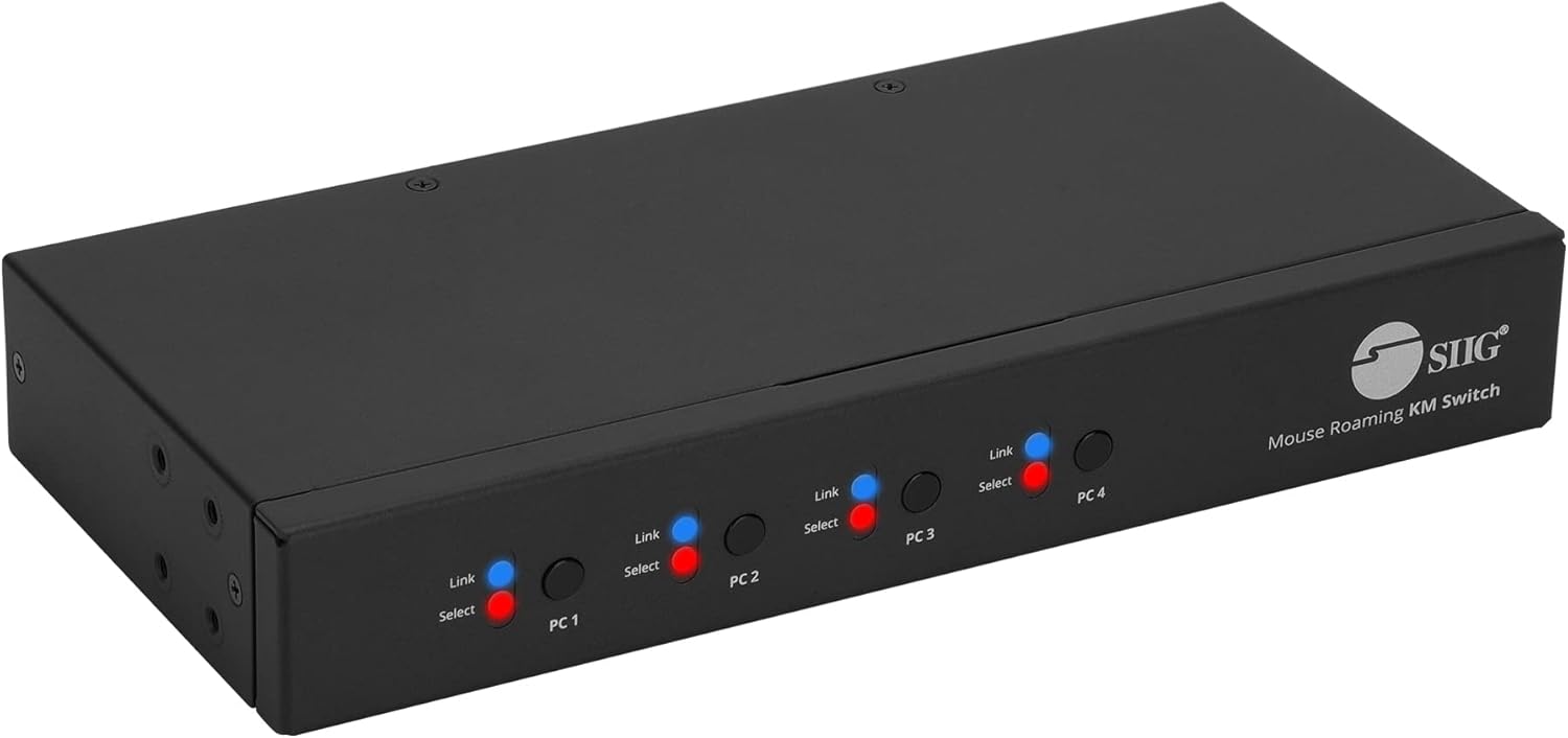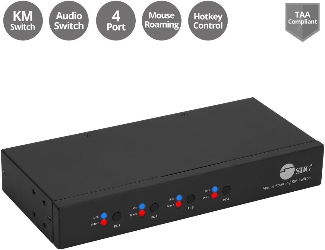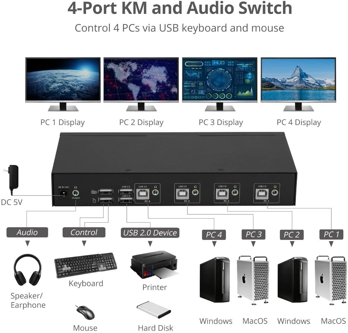 ✅ This 4-Port mouse roaming KM switch, allows you to share one set of keyboard, mouse, audio and USB peripherals among 4 USB PC system. You can select which PC you want to control by push button, hotkeys or mouse roaming (Moving the mouse cursor from 1 display window to another)