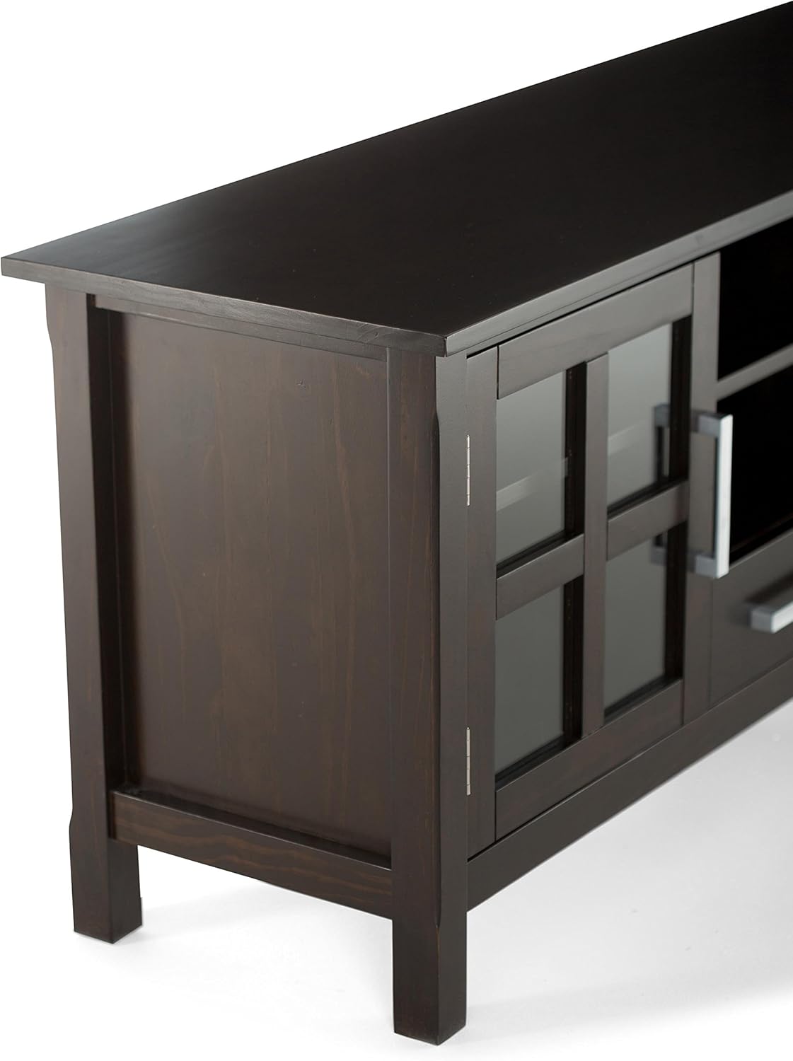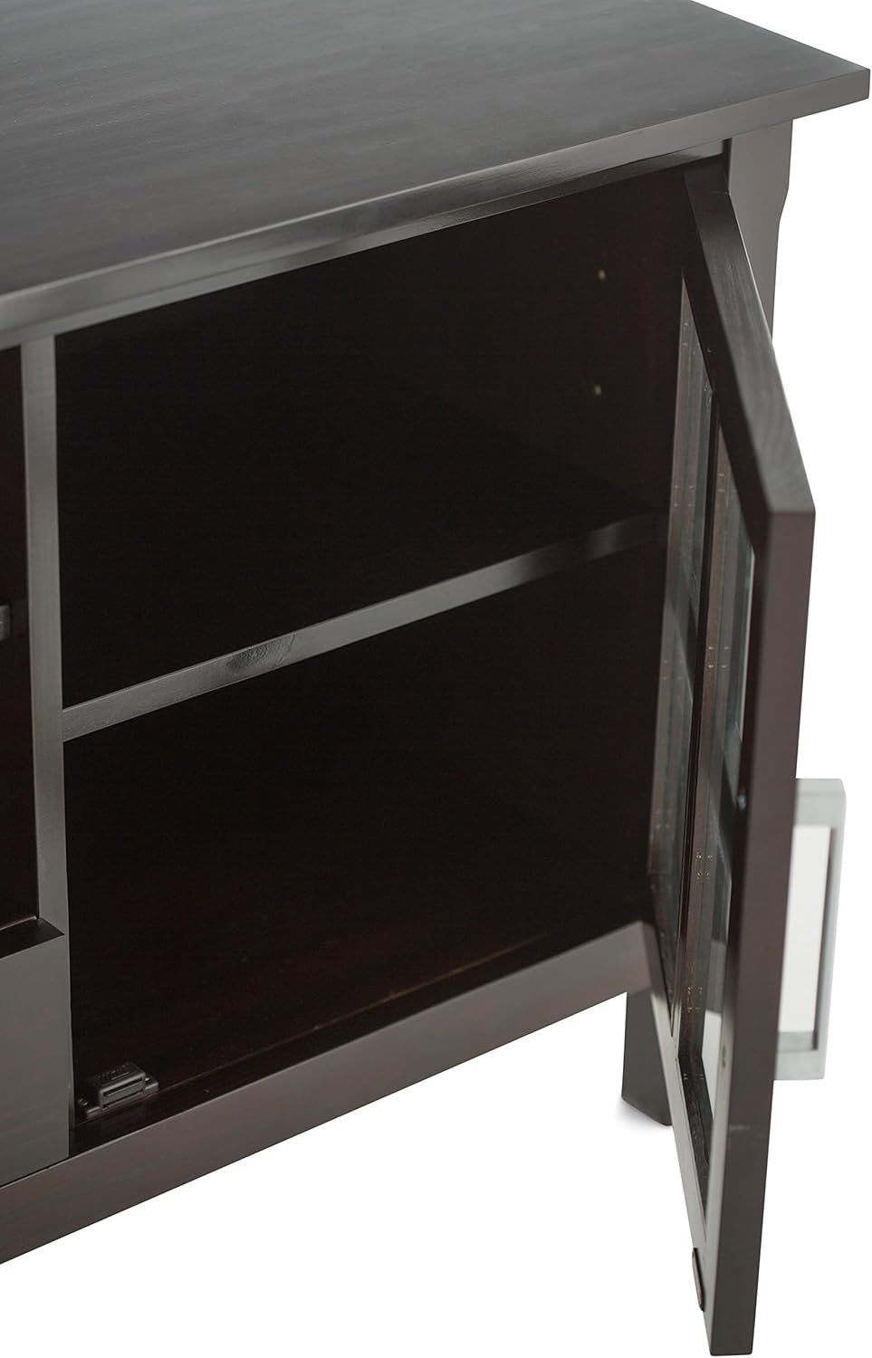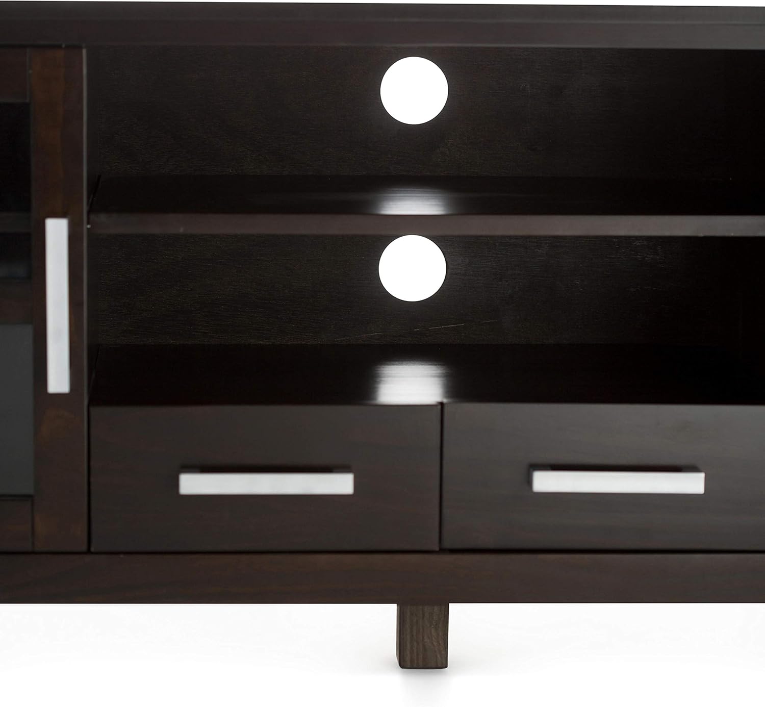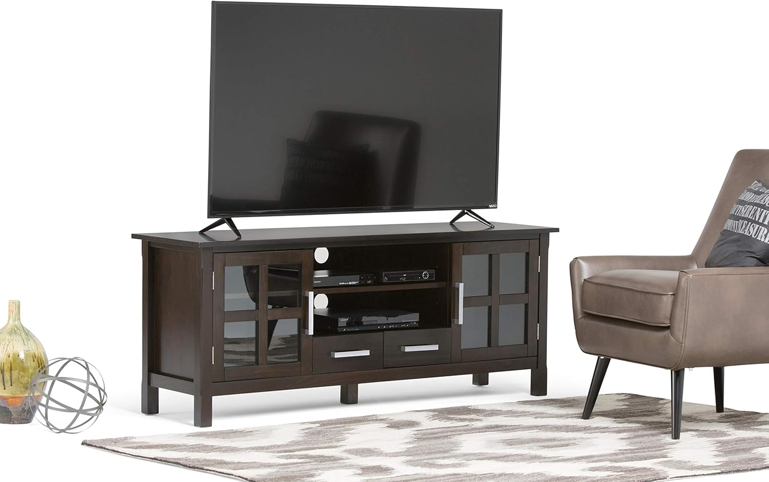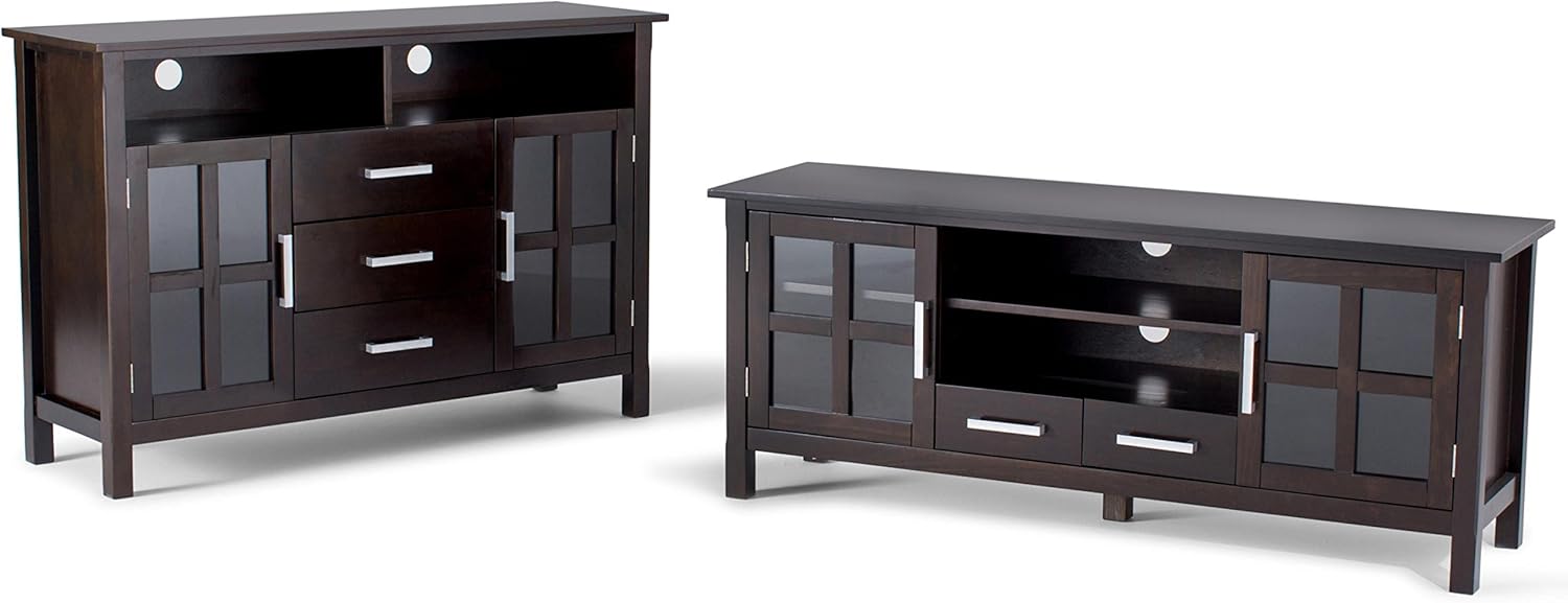 TVs are getting bigger and bigger. You need to find the perfect TV stand that fits the size of your TV and allows you to view content comfortably. The Kitchener TV stand is the perfect size for TVs up to 65 inches. The Kitchener TV stand has plenty of storage and room for all of your media and gaming devices. It has a large open area located in the center with an adjustable shelf and two drawers. The two side storage cabinets open to an adjustable shelf. The unit features cutouts for cable management for easy installation of the TV and media components. Easy installation of the TV and media components. Styling includes a square edged tabletop, brushed nickel pulls, and square legs. Efforts are made to reproduce accurate colors, variations in color may occur due to computer monitor and photography. At Simpli Home we believe in creating great, high quality products made from the finest materials at an affordable price. All of our products come with a 1 year warranty and easy returns if you are not satisfied.