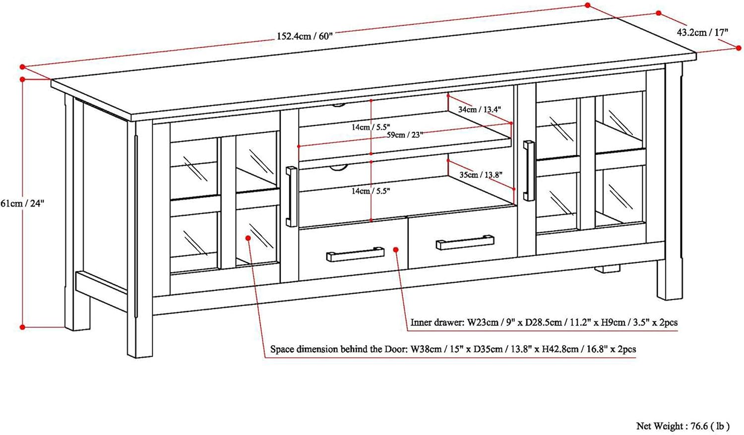 It comes with two (2) side cabinets with tempered glass doors that open to adjustable shelves, a central area that includes two (2) open shelves and two (2) drawers with plenty of storage space.