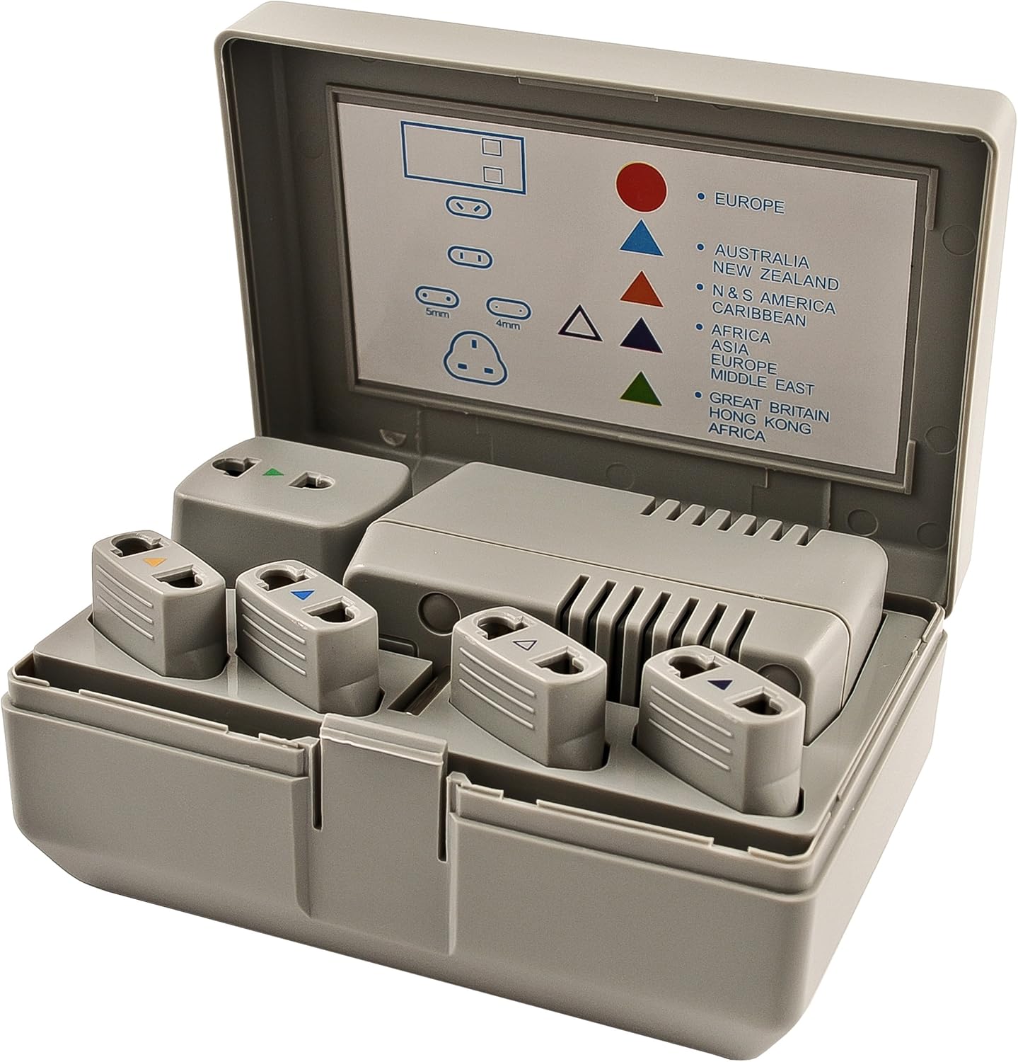 The foreign travel conversion kit around the world converts 220V to 110V uses American products abroad. 50/1600-WATT provides your foreign electricity travel needs in most foreign countries. This kit is travel products whose qualification is 50 watts-1600 watts. 50-Watt is Designed for Blackberry, Phones, Cames and Other Battery Chargers, Ipods, Razors, Shavers, Answering Machine Devices, Tape Rememberrs, Calculators, Cassettes, Radios, etc. 1600-Watt is designated for sum heating-type appliances Such as Heating Pads, Hair Dryers Up to 1600-Watt, Bottle Warmers, etc. This converts is not Meant for Kitchen Appliances, Heating Appliances, Hair Straightners or electric tools.