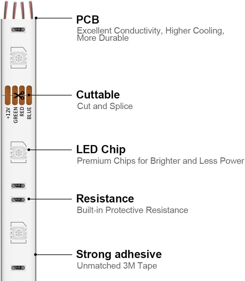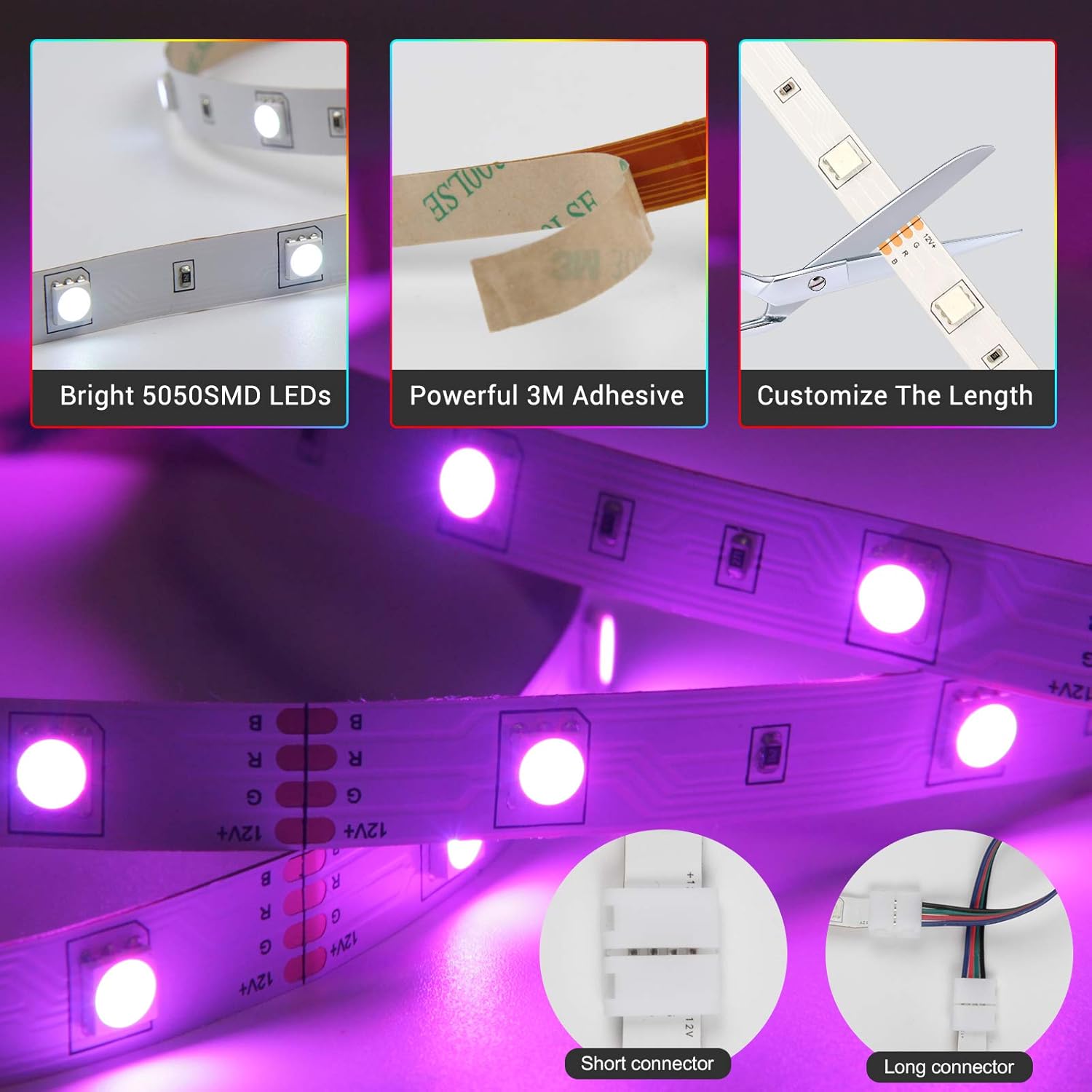 Peel the tape and paste the led lights of the strip to clean the surface. The performance uses a strong adhesive and a genuine adhesive that has high resistance and lasts a lot of time. Flexible long connectors perfectly suitable for corners. Cut and connect easily. Only plug and reproduction, easier and more stable connection