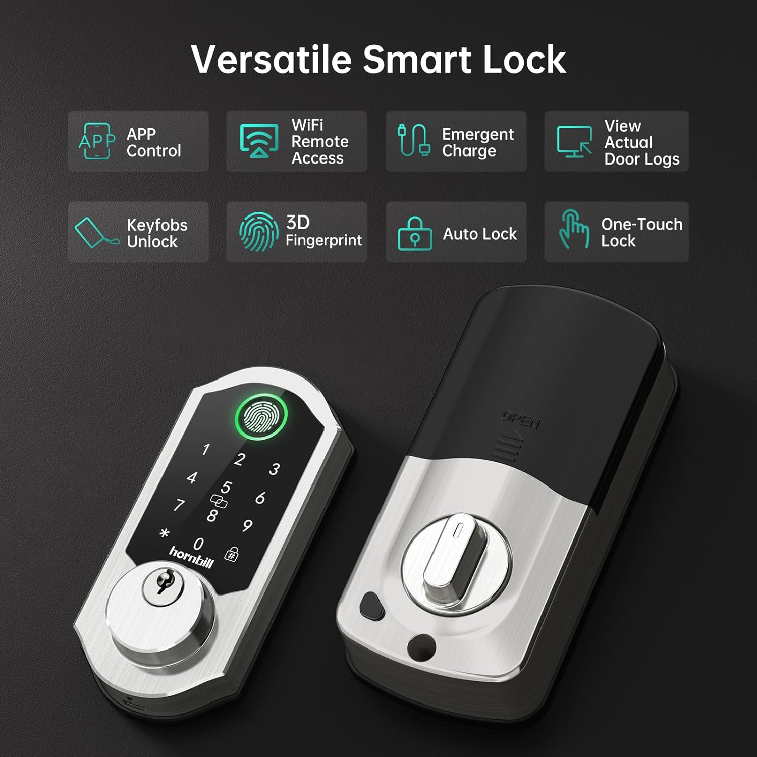🔒【10 in 1 WiFi Deadbolt】It features biometric fingerprint reader + Bluetooth keypad + remote lock/unlock/view door records/app control + virtual passcode + keychain unlock + auto-lock timer setting in 30 minutes/one-touch lock + passage mode + physical keys/emergency charging (Type-C) + low battery alert + Alexa/Google Home voice control.