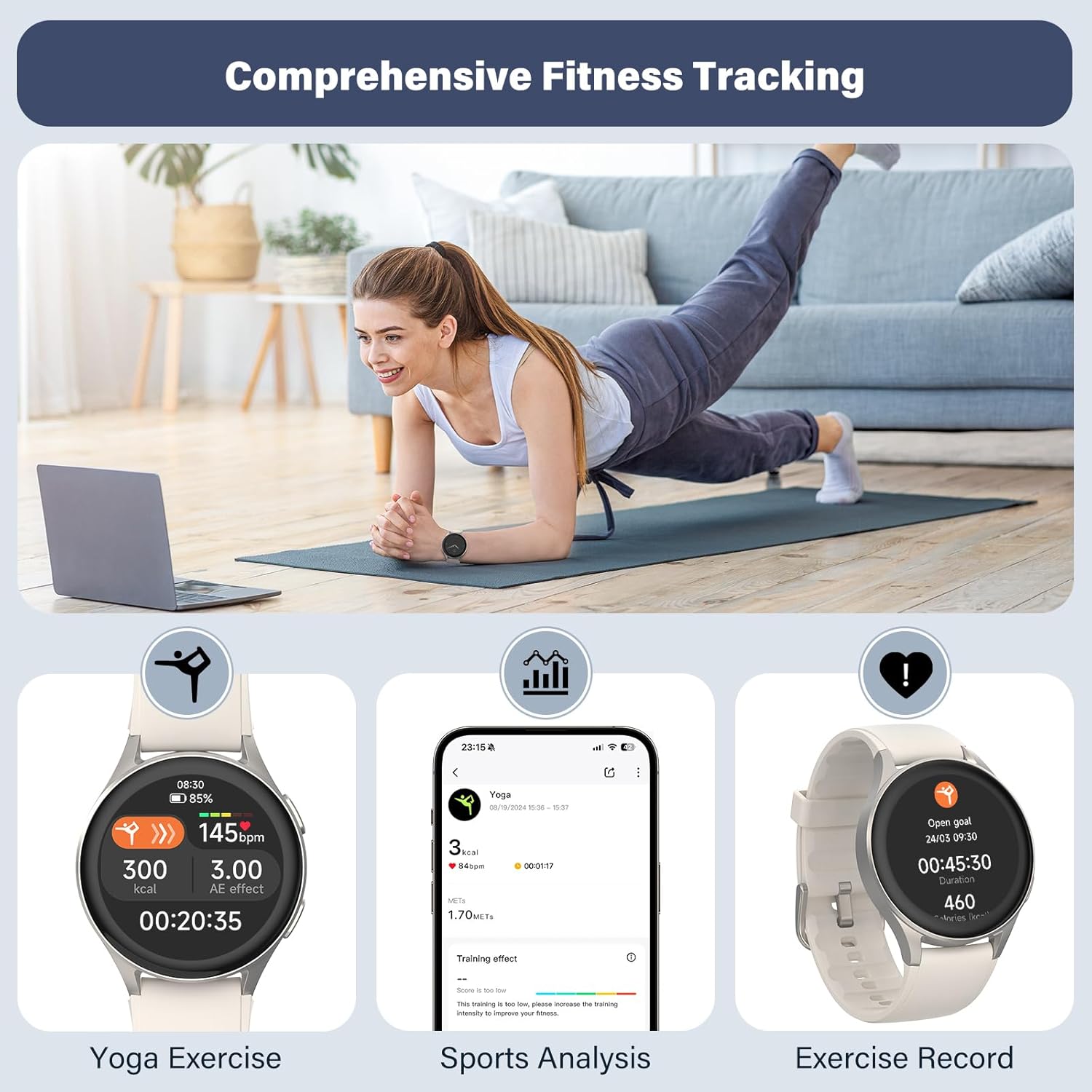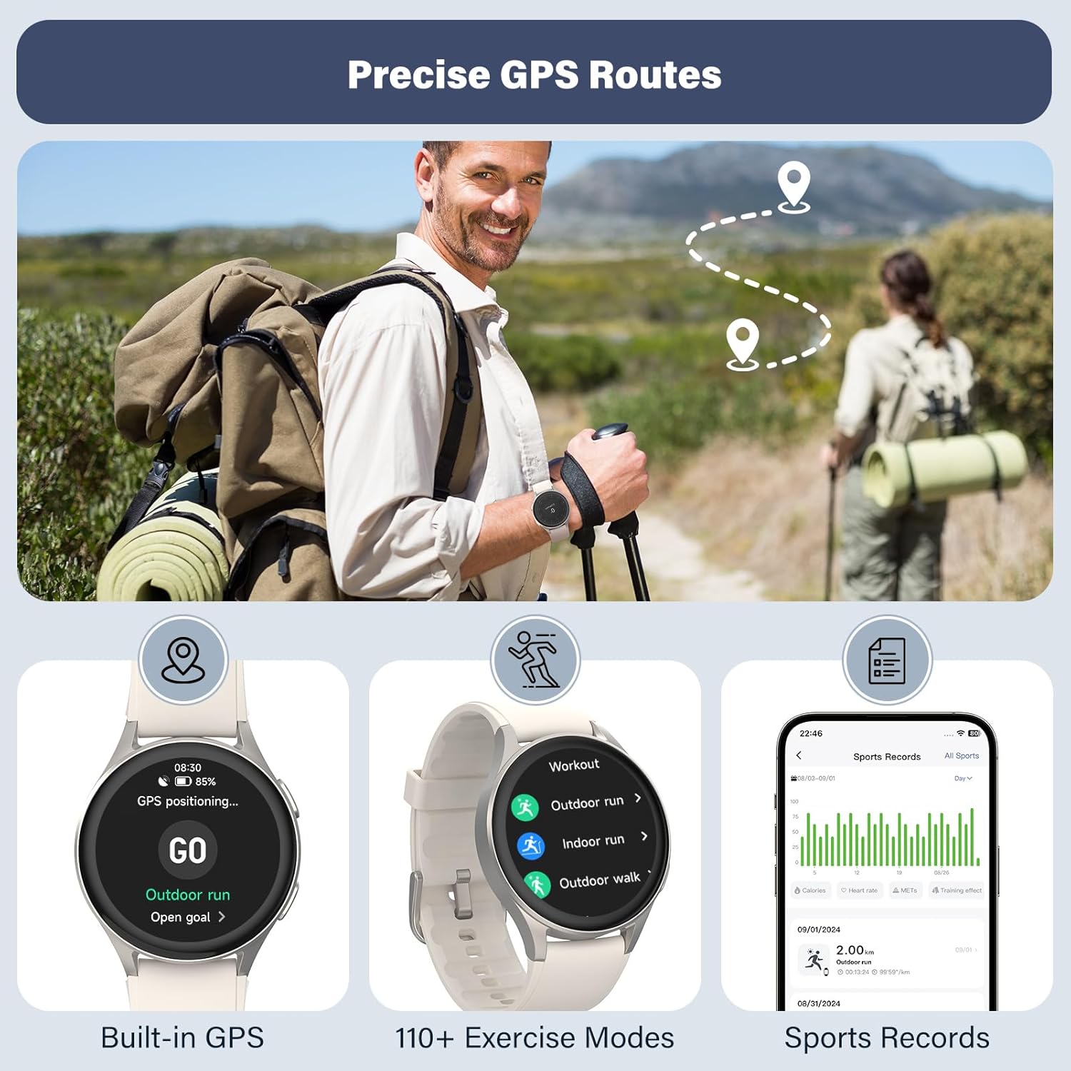Comprehensive sports tracking: This smartwatch offers comprehensive sports tracking in various activities, such as outdoor running, hiking, swimming, and indoor exercises such as yoga, Pilates, and HIIT. Monitor key data such as distance, intensity levels, VO2 max, recovery time and aerobic training effect. With built-in GPS, compass and barometer altimeter, it ensures accurate tracking and orientation, making it indispensable for outdoor enthusiasts and fitness lovers.