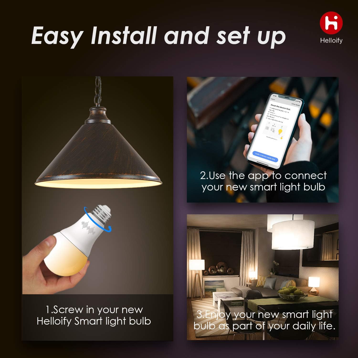 Helloify High Brightness LED Smart Bulb: We always hear people complain that smart bulbs are not bright enough for colored light, but Helloify smart bulbs always keep high brightness, from 2700K to 6500K and 806 lumens, perfect for your needs, make changes in the home with your mood. Voice Control: Control the Helloify smart bulb through your voice with Alexa. Simply give a voice command to turn on/off or dim/brighten the light, even change the light to the specific color you need. No hub required and easy to install. No subscription needed. APP Remote Control: We hope to meet the various needs of consumers through simple APP operations. Even if you are not at home, you can control the on/off of your smart bulb with your phone via the Smart Life app. Easily set a schedule for your smart bulb. Customize your home lighting system, such as setting the lights to turn on at dusk or off at dawn. You can create a group for all your smart bulbs and control them all with a single command. Powered by 2. 4GHz Wi-Fi network. Wide use of energy saving: With LED technology, this bulb will save up to 80% energy consumption compared to a normal bulb. Save your electricity bill with the latest lighting technology. This bulb can be used anywhere you need colorful light, such as home indoor lighting, hotel, meeting room, museum, restaurants, bar, cafe, Christmas decoration, birthday party.