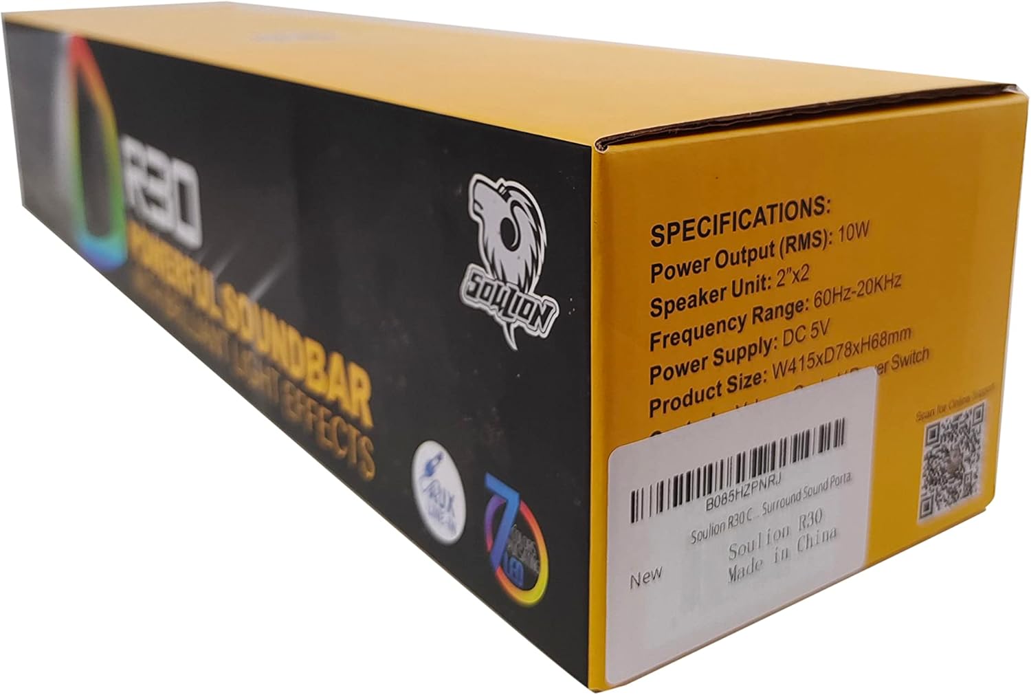 [Brilliant Lights Effects] The sound bar adopts Rainbow LED lights on both sides. It provides a more attractive environment when listening to music or watching movies. There is a small button behind the sound bar that controls the light on and off.