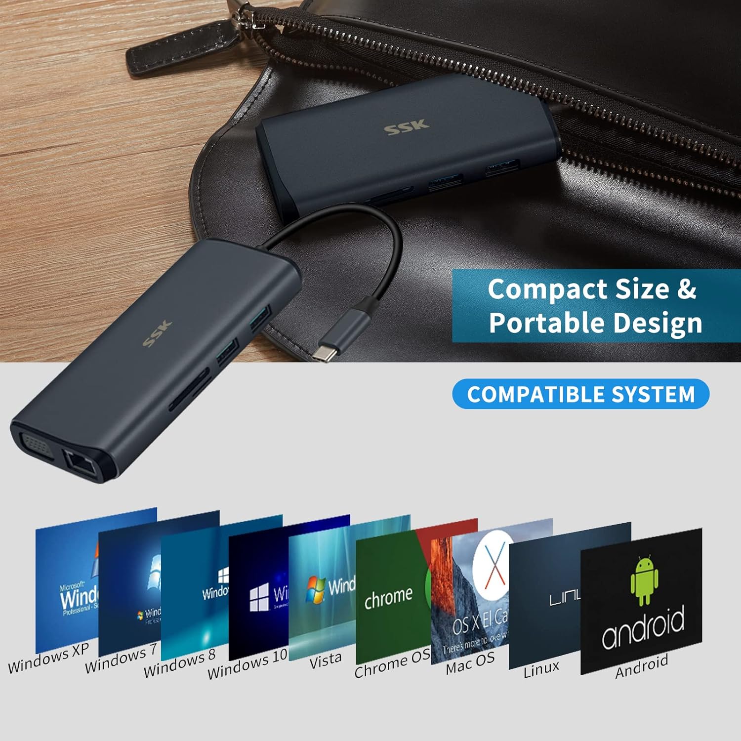 【Advanced chip and stable performance】 SSK USB C Station dual monitor adopts the advanced intelligent chip, all 11 ports can function simultaneously, only a simple connectivity of plug and play. It is reliable, which can effectively avoid overload, excess voltage, overcurrent, short circuit, overload, voltage regulation, Tec temperature protection. It is thin, light, compact and powerful with multiple ports. Portable computer coupling station, facilitating your work and life
