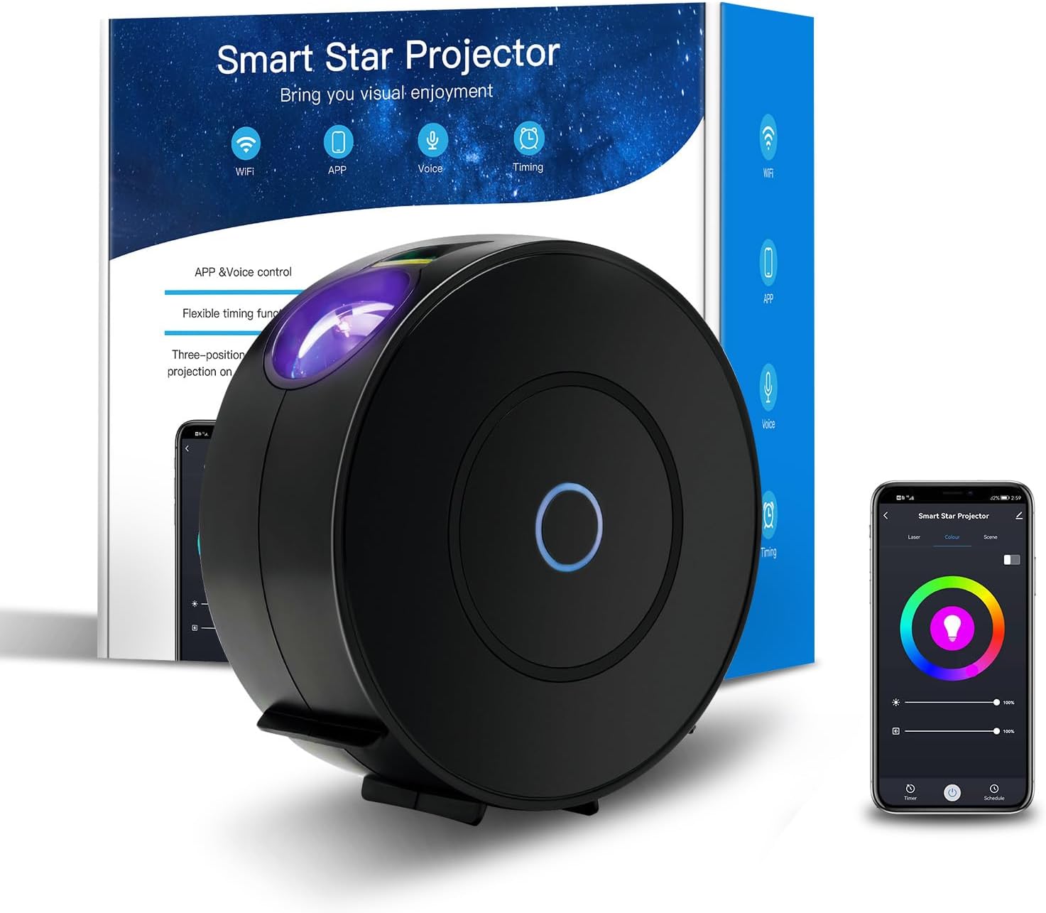 【Intelligent application control and voice】 The Smart Galaxy projector is compatible with the Smart Life phone and is compatible with Alexa and Google Home. Round buttons on the side of the fuselage can also be controlled. Control the color, brightness and the scene projected by the Smart Star projector through VoiceCommands, compared to remote control, it is more intellgente and Corwenient.