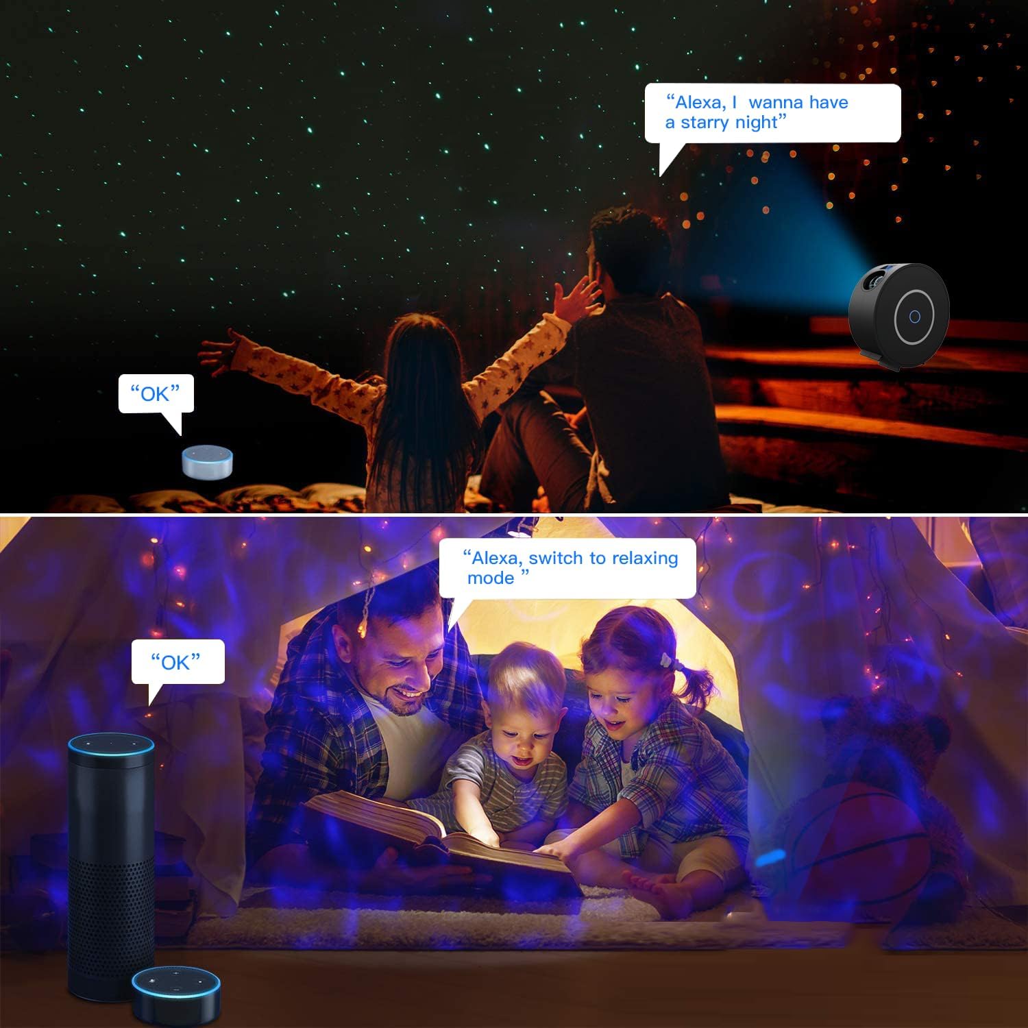 【Synchronization function and. Noise reduction technology】 You can establish this Galaxy night light to turn on and offoutomatically at any time you want, using the latest noise reduction technology, which can create a relaxing and pleasant environment for you and let your family enjoy a comfortable dream. You can easily use the “Smart Life” application to control the switch, color and brightness of the LED projector, and even turn on and off this night light projector in the specific time without altering your children.