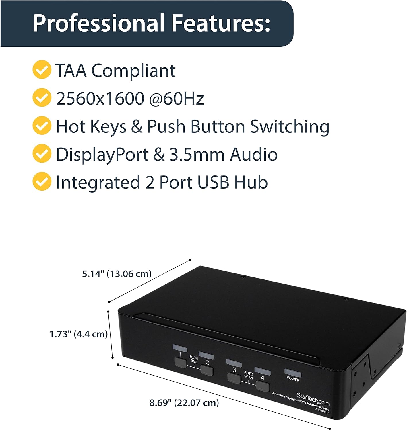 The StarTech 4-Port USB Dual-Link DVI KVM Switch with Audio controls up to four connected PC or Mac computers. The StarTech 4-Port USB Dual-Link DVI KVM Switch lets you share two additional peripherals between the connected computers as if they were directly connected. It is suitable for high-quality still imaging applications involving healthcare with a maximum resolution of 3840 x 2400. It features front-panel switching buttons and hot keys offering a small form factor with rear connection ports that minimize workspace disruptions. The Dual-Link DVI KVM Switch with Audio is perfect for graphics applications. Dimensions: 1.7″ H x 5.1″ W x 8.7″ L. Comes in black and has a steel housing for added security. Audio Specifications: 7.1-channel high-definition audio support plus dual-channel analog stereo and microphone, WQXGA 2560 x 1600 video resolution. Features one 20-pin DisplayPort female connector, two 3.5 mm mini-jack female connectors, and four 4-pin USB A female connectors. Features four DisplayPort female connectors, four USB B female connectors, and eight 3.5 mm mini-jack female connectors. Power: 0.8 A input current, 110 – 240 VAC input, 1.5 A output current, 12 VDC output, Plug Type: M, Center Tip Polarity: Positive. LED Indicators: 1 Power, 4 Green – Online indicator (one LED per port), 4 Red – Select indicator (one LED per port). Port). OS independent for added convenience. Temperature: 32 to 104 degrees F operating, -4 to 140 degrees F. Storage 10°C, Relative Humidity: 0-80%. Rack-mountable for easy use. USB-connected keyboards, mice and peripherals, hotkeys and push buttons enable full plug-and-play compatibility. Includes one 4-Port DisplayPort KVM with audio, rubber feet, universal power adapter (NA/UK/EU), and manual. Weight: 1,000 g (3,34 oz). 3-year warranty.