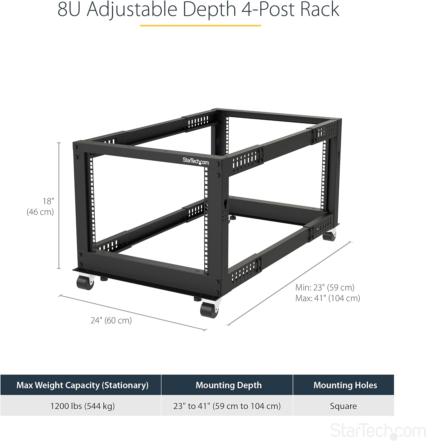 Adjustable depth: 4-Post 8u Open Frame Back with 4 vertical rails and adjustable assembly depth 22 “to 40” (56 cm to 101 cm); Compatible with several servers / switches / data / AV and other IT equipment; EIA/ECA-310-E compatible with