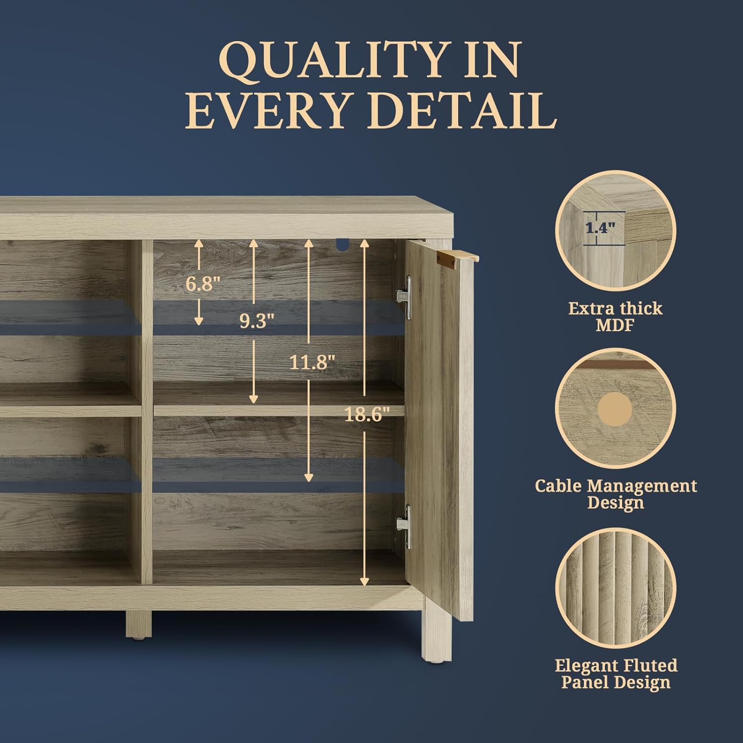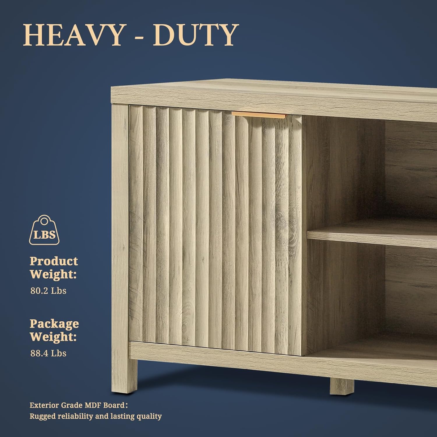 Heavy -duty TV cabinet for upper stability: built with ultra thick external degree MDF board, net weight 80.2 pounds, gross weight 88.4 pounds, guaranteeing durability and luxurious enjoyment