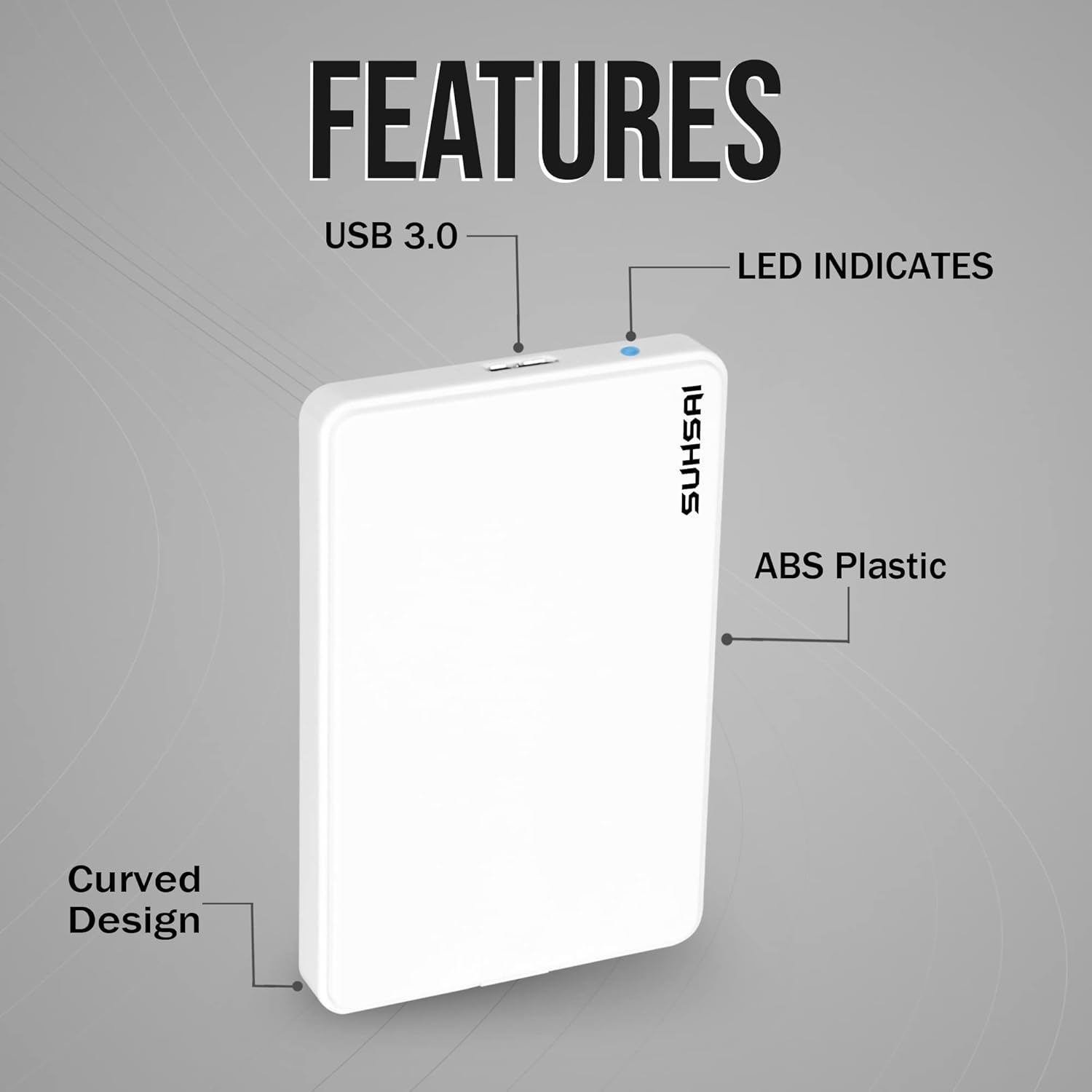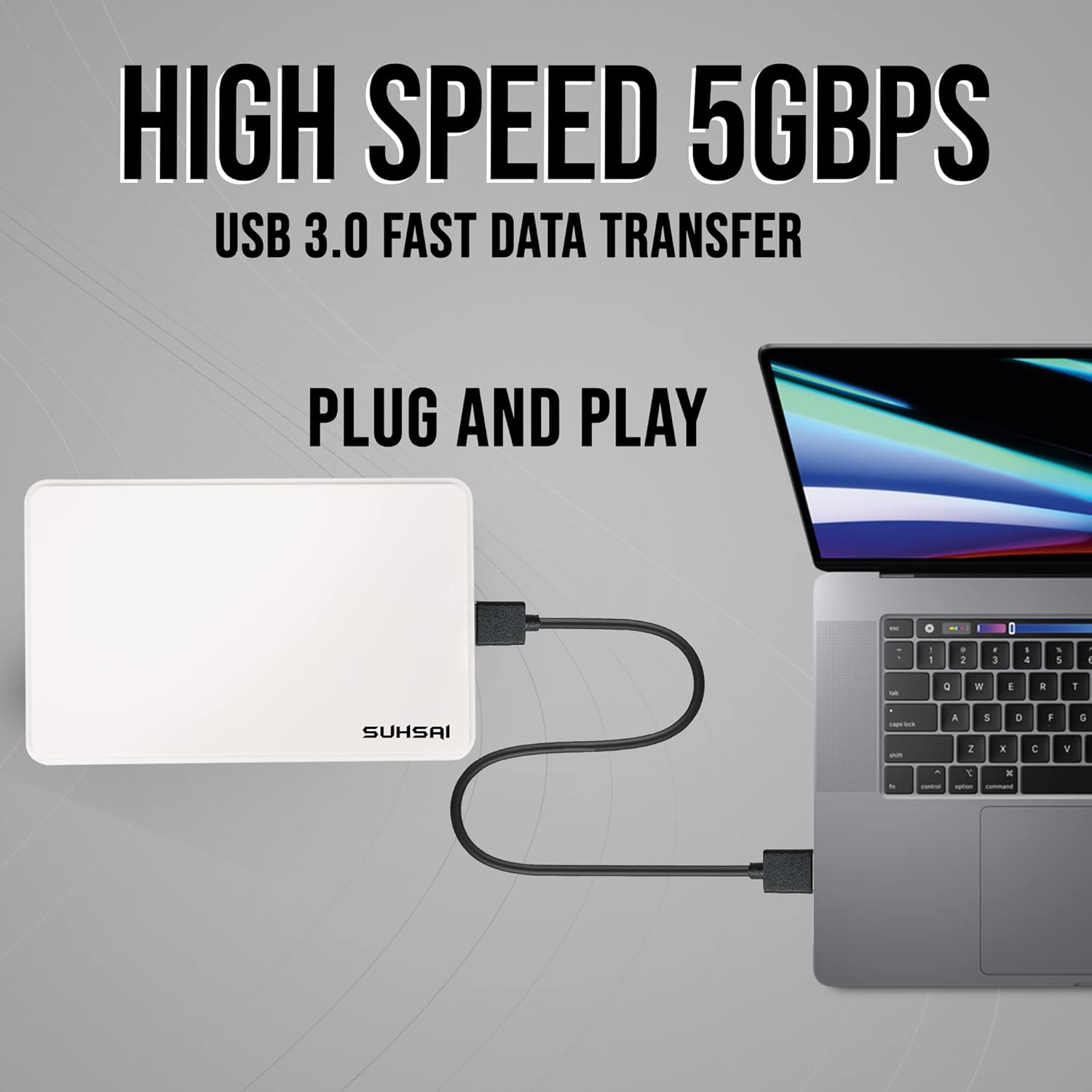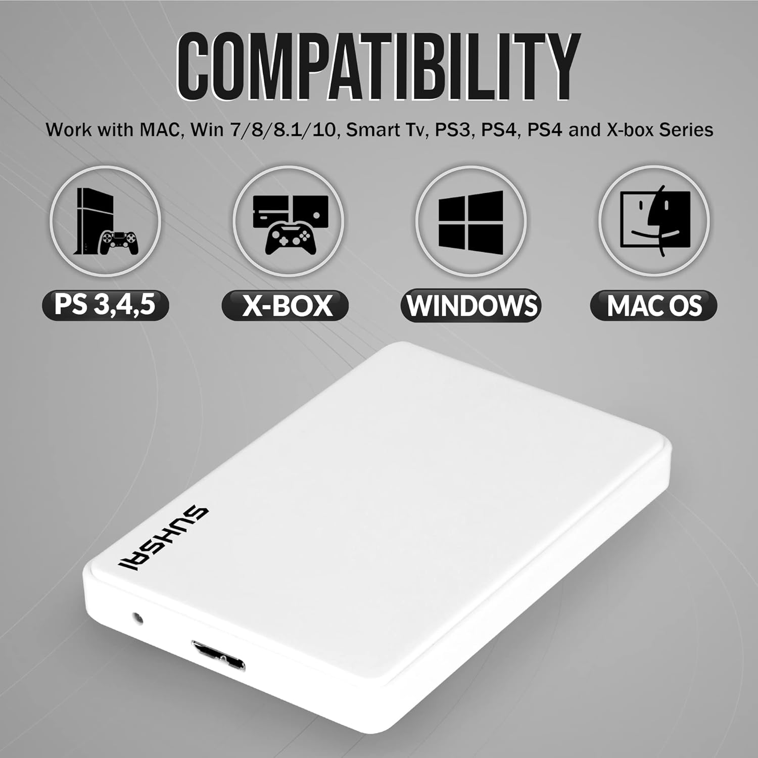 SUHSAI EXTERNAL STORAGE DRIVE: Suhsai External Hard Drive is a safe and secure way to store your data and multimedia. Our external drive allows you to quickly store and backup large amounts of data while also improving PC performance. With our portable external hard drive, you can easily back up your essential data, projects, photos, movies, video, and other files, and retrieve them from your computer with a single click.