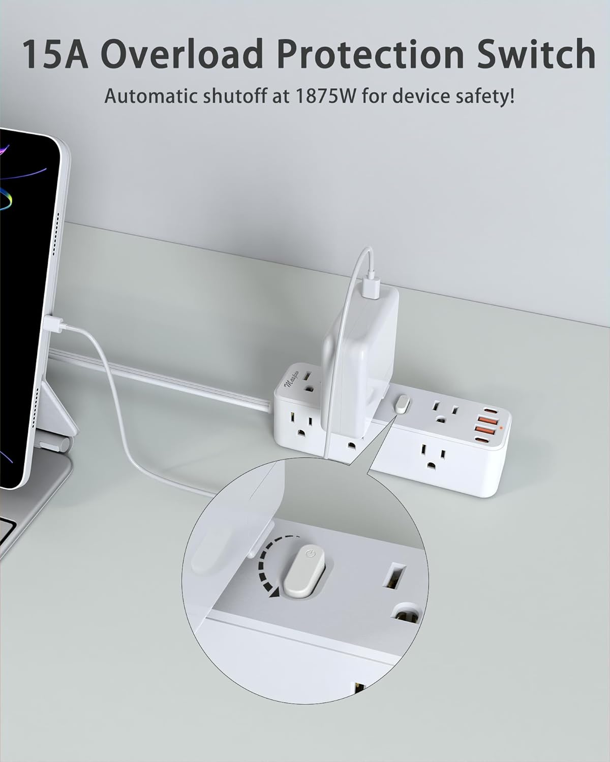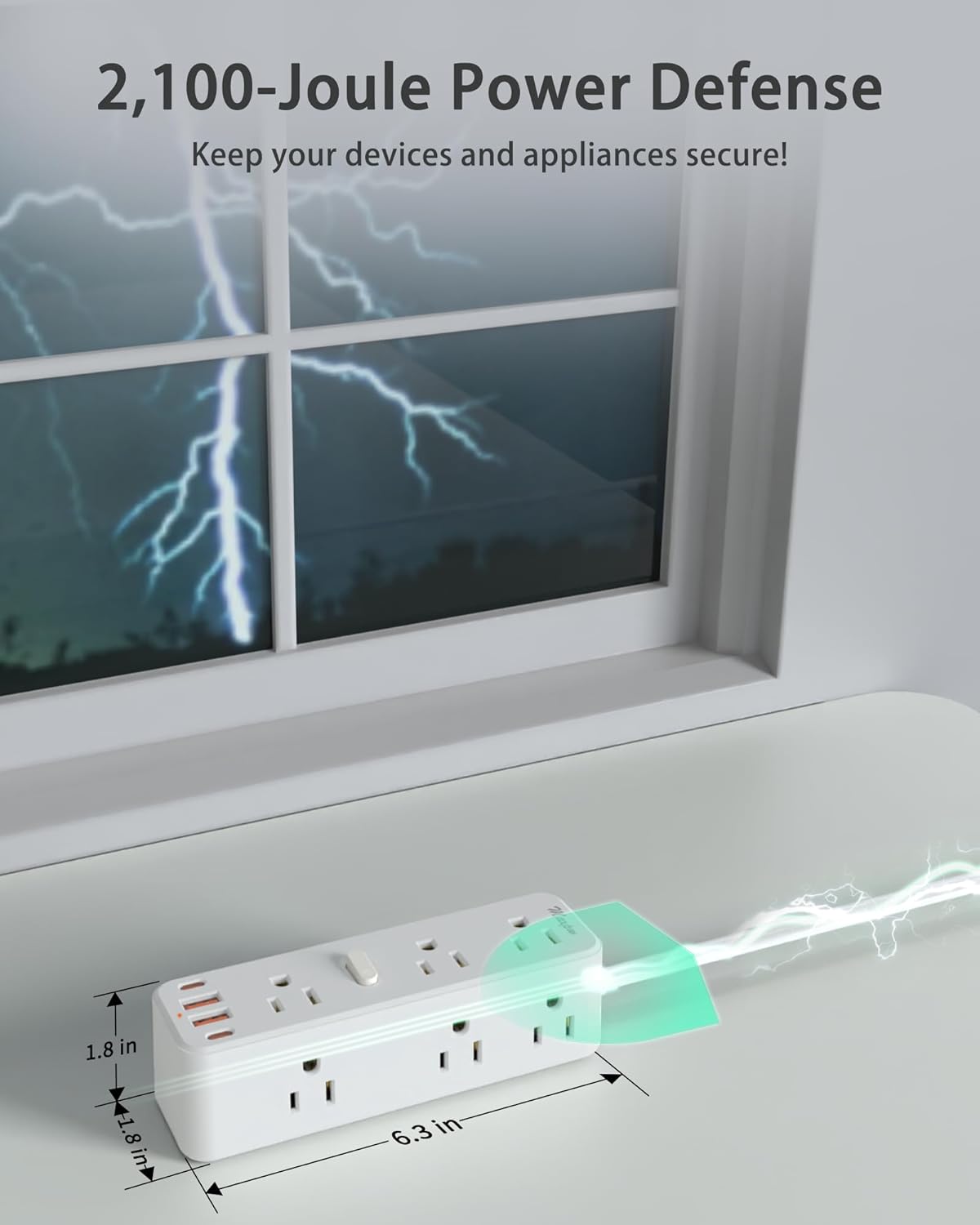 【2100 Joules Surge Protector】- This power strip provides 2100 Joules surge protection value, don't worry too much in thunderstorms, our surge protector can protect your equipment from power surges and spikes in time, and with 15A overload protection switch, even if you go out and forget to unplug it, don't worry, more than 1875W will be automatically disconnected to protect the safety of the equipment. Let you reduce worries!
