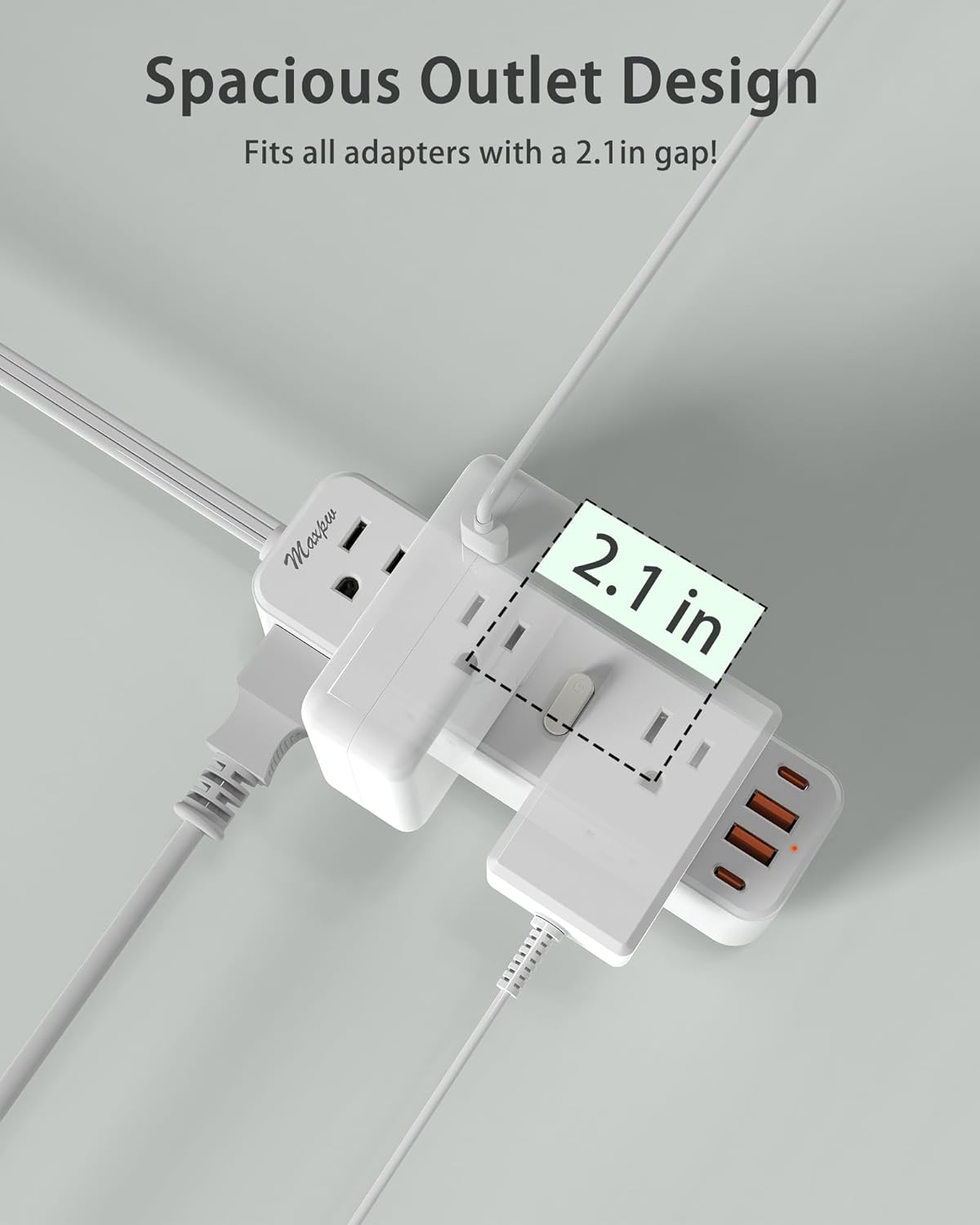 This power strip with surge protector distinguishes itself from ordinary compact charging stations by being able to accommodate large and bulky outlets with a spacing of 2.1 inches, instantly connecting to bulky outlets without blocking each other, a must-have tool for! offices, homes, workspaces and conference rooms! Plus, the newly updated slimmer connector – 0.33 inches allows you to easily and effortlessly fit it into backpacks and bags without bulging, and take it anywhere without stress!