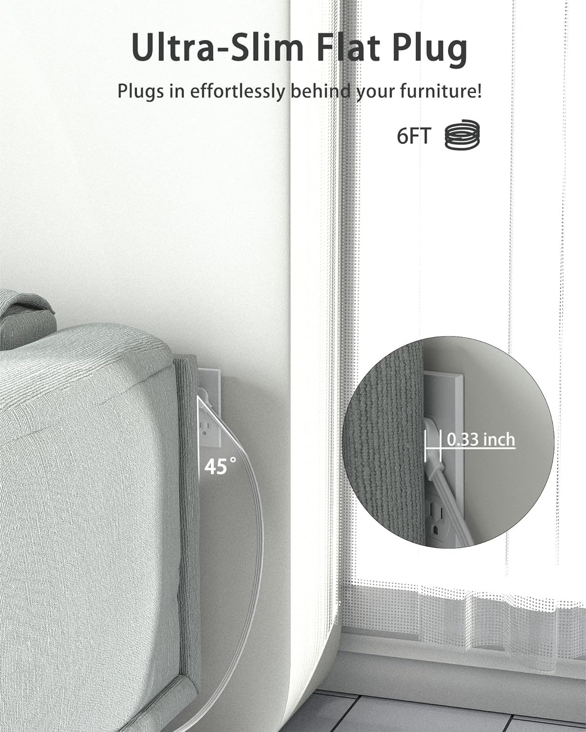 【Family Companion】- Clear orange indicator light for a good night's sleep. 0.33 inch slim flat plug and 6ft flat extension cord make it easy to reach any wall outlet and hide behind nightstands and sofas. And a 45° right angle design won't block the bottom receptacle of your duplex wall socket, wasting no space in your home.