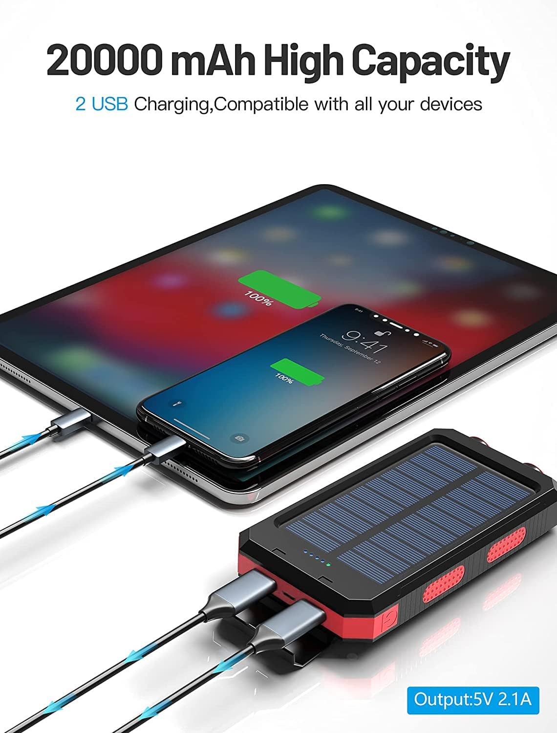 ✅Ultralight Solar Charger: Built-in 20000mAh high-quality mobile power bank, compatible with iPhone, iPad, Android and 99% of USB devices. The portable solar charger is equipped with a compass and two LED flashlights, it is essential outdoor equipment. In addition, the total power of 74Wh is safe for air travel. Therefore, it is the best gift for your family and friends on important festivals such as Halloween, Thanksgiving, New Year, Christmas, Valentine's Day, Mother's Day and Father's Day, etc.