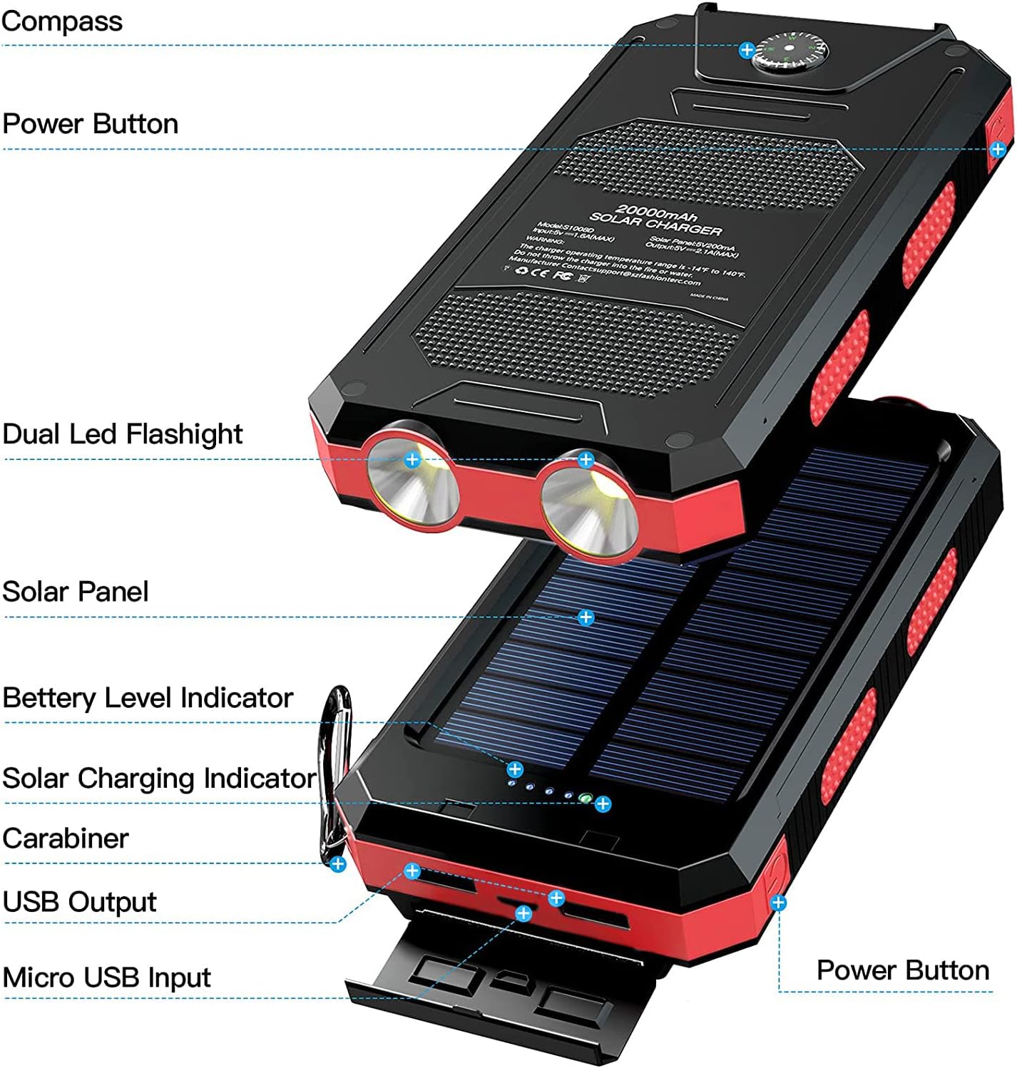 ✅ Sturdy, Durable and Waterproof: Made of eco-friendly silicone, ABS and PC materials, this sturdy solar power bank has excellent heat dissipation ability. The power bank has a protective cover attached to the outside of the charging/discharging port, so it has a waterproof and dustproof function. In addition, it is also equipped with a carabiner, which you can hang on your backpack while climbing the mountain and charge this power bank via solar energy.