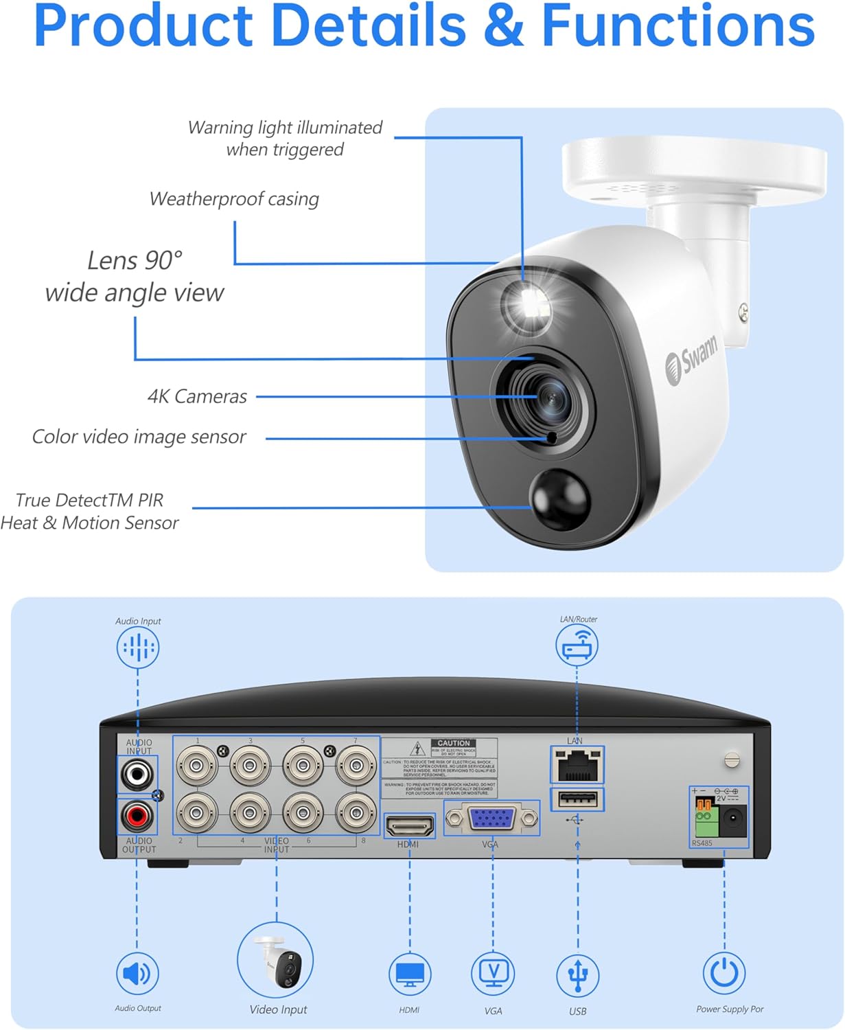 DETECTS HEAT AND MOTION TO REDUCE FALSE SIGNALS; This DVR security system detects warm moving objects, such as people, and triggers notifications so you can take action; Fewer false trigger signals save time and stress; Swann's Smart Search can select areas of the image