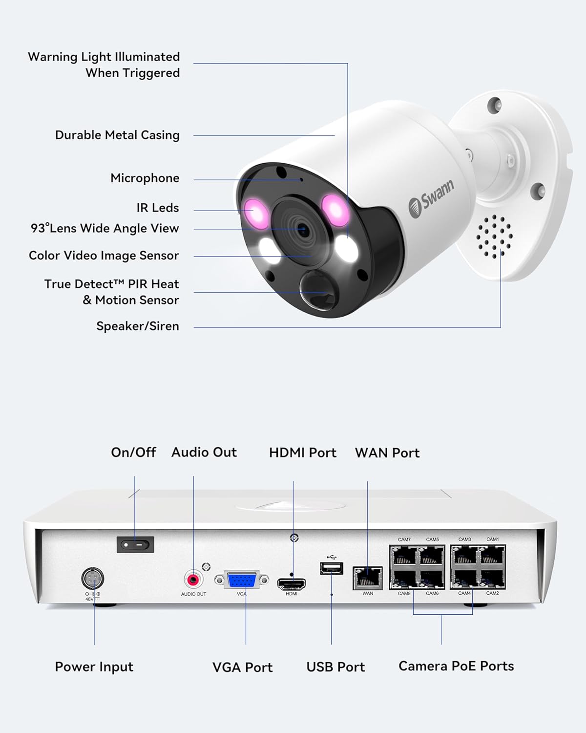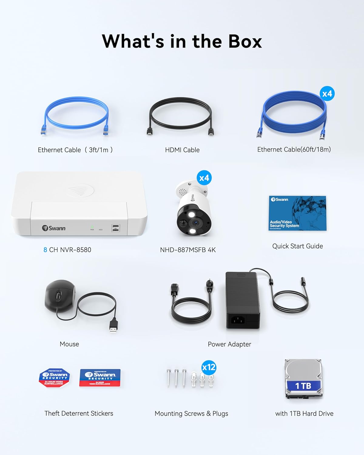 Continuous recording 24/7 enabled: With a pre -installed 1 TB HDD, users receive a continuous recording option 24 hours a day, 7 days a week, or Swann True True event recordings and movement activities only ; Get up to 365 days of stored video and less false alarms with true home security cameras.