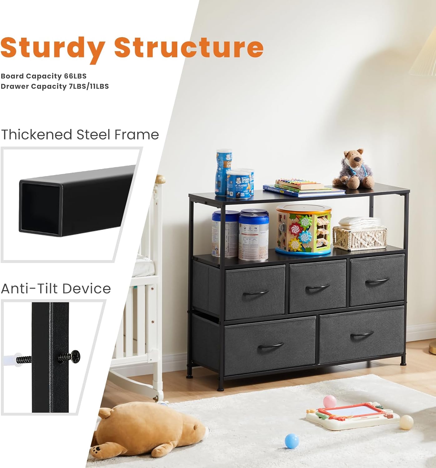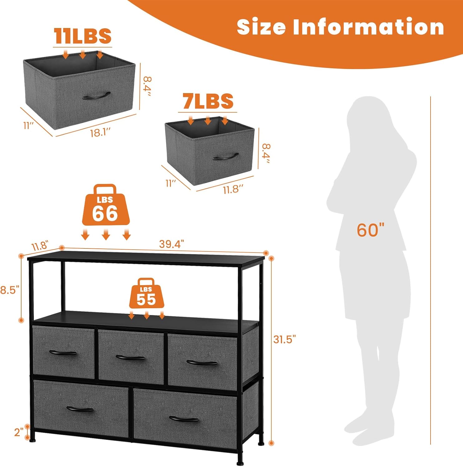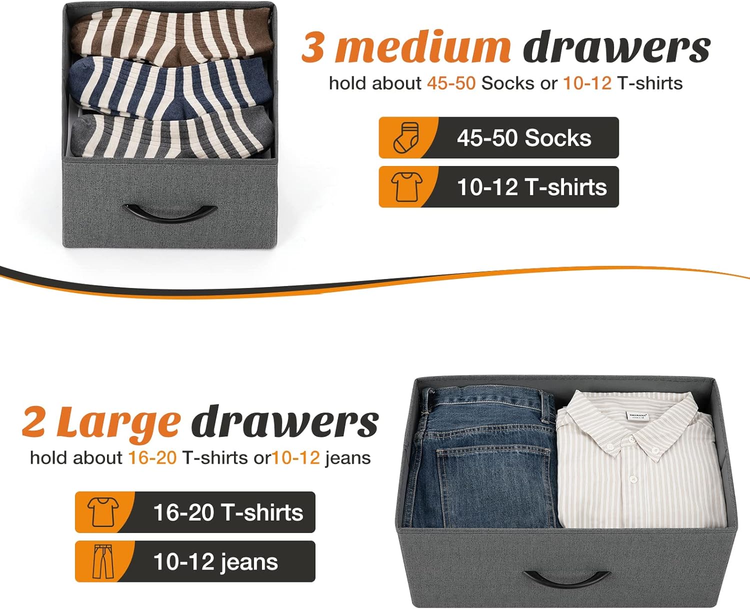 5 Drawers: 3 drawers on the top tier and 2 large drawers on the bottom tier. All fabric drawers are removable and the entertainment center's storage capacity allows you to organize various items. The top drawer can store your frequently used items and the bottom drawer can store various unused or infrequently used items to better organize your space.