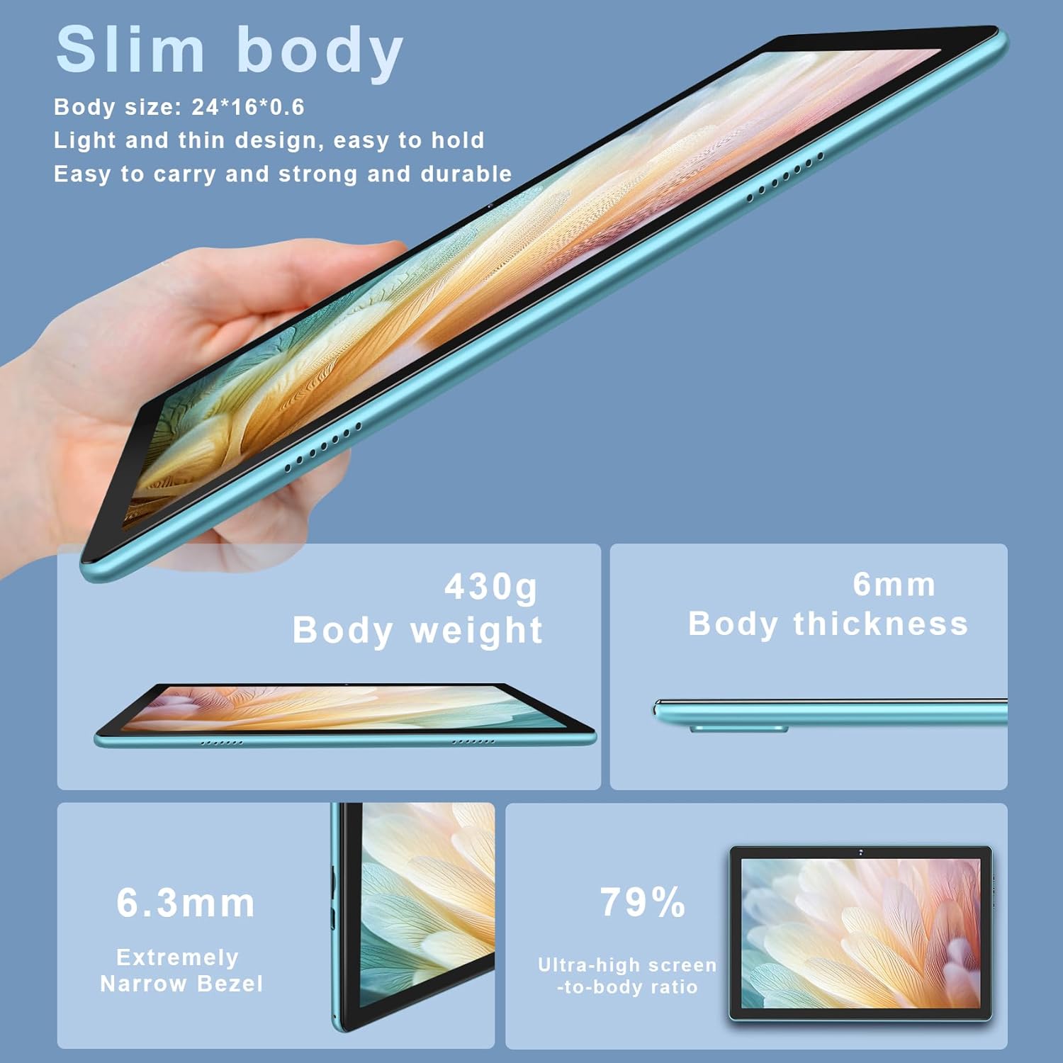 【6000mAh Battery + Lightweight Metal Body】D3 tablet is equipped with a 6000mAh battery, a single charge can last up to 8 hours, maximize your downtime for reading, browsing the web, watching videos and listening to music at home and on the go. Moreover, it is 18% lighter than other tablets on the market, weighing only 430 grams, and at 6 millimeters thick, the tablet is lightweight and portable.