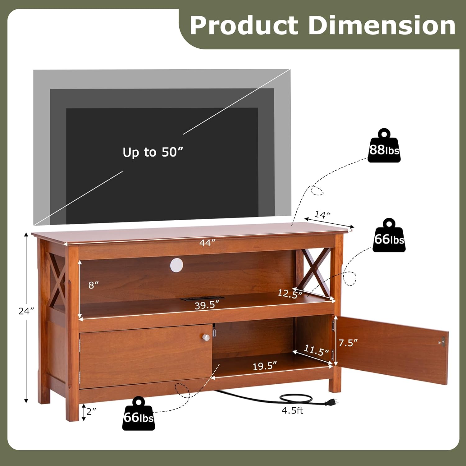 【Size】Product dimension: 44” x 16” x 24” (L x W x H), Cabinet dimension: 39.5”L x 14”D x 7.5”H, Net weight: 48.5 lbs, Maximum table weight : 88 lbs, Maximum shelf weight: 44 lbs, Maximum cabinet weight: 44 lbs.