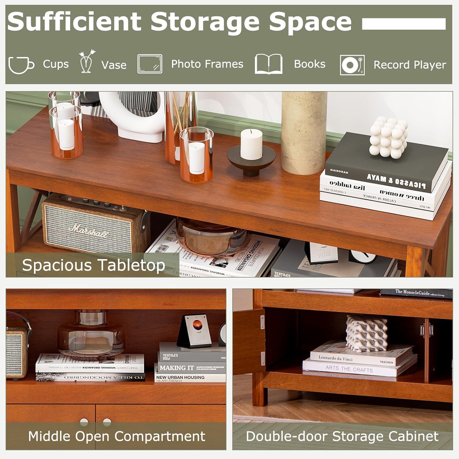 【Stylish Design】Designed with a stylish appearance and practical design, this high-quality storage console is a timeless addition to your home decor and also suits your home decor. Plus, the large board allows you to put some plants on top for a green touch.