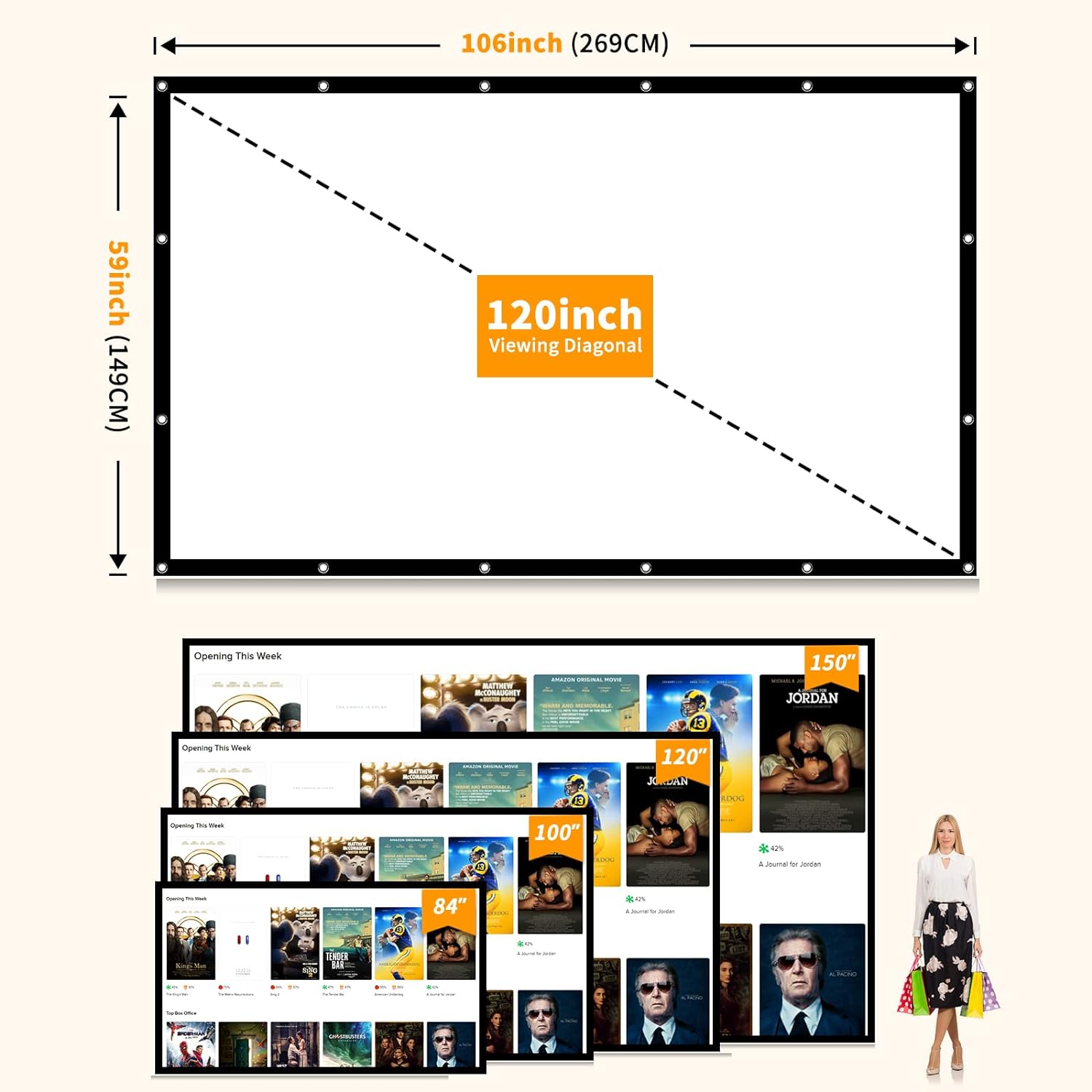 Wrinkle-Free Material: The 120-inch projector screen uses thick and elastic soft-touch polyester fiber material to ensure it does not wrinkle after folding or compressing, providing clearer images, brighter colors and no color. Please rest assured that all of our outdoor movie screens will undergo a rigorous quality inspection process before shipping, so there will be no spots on the screen that affect the viewing experience and they are thick enough that you cannot see what's behind.