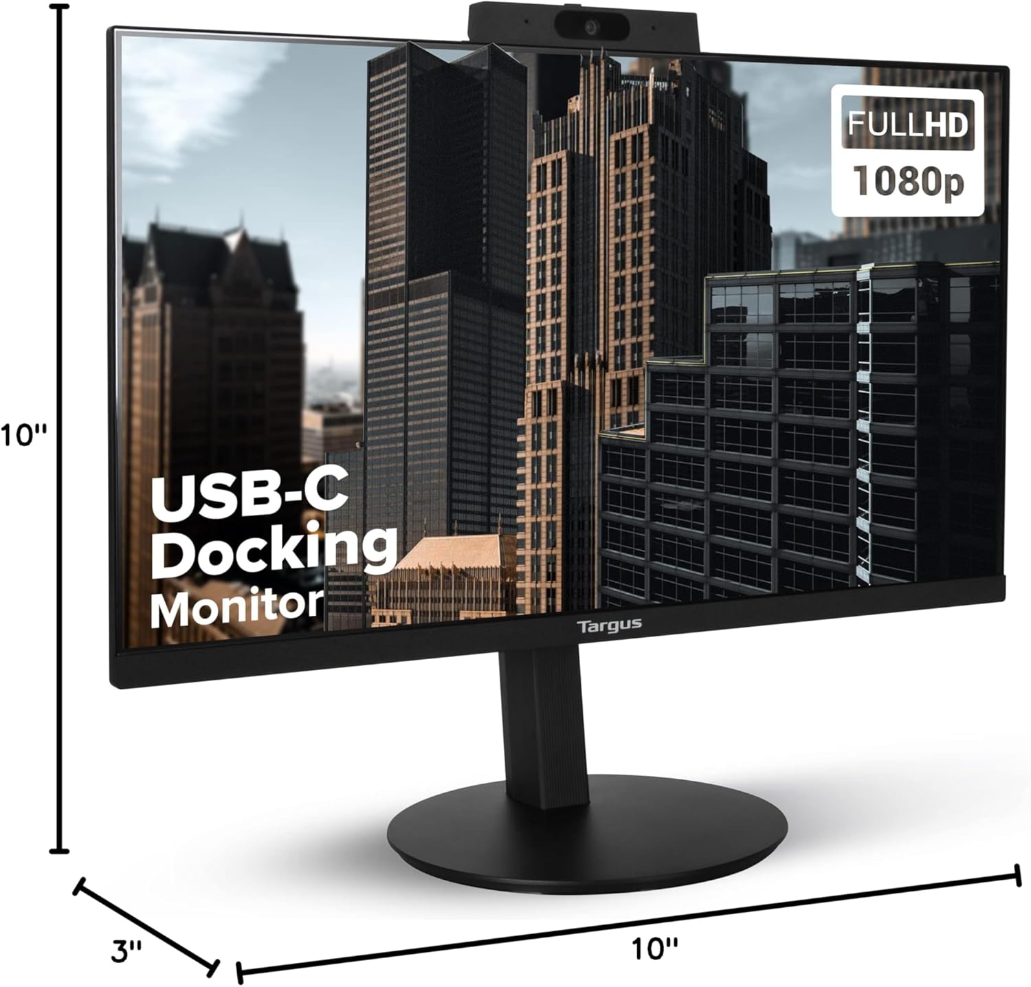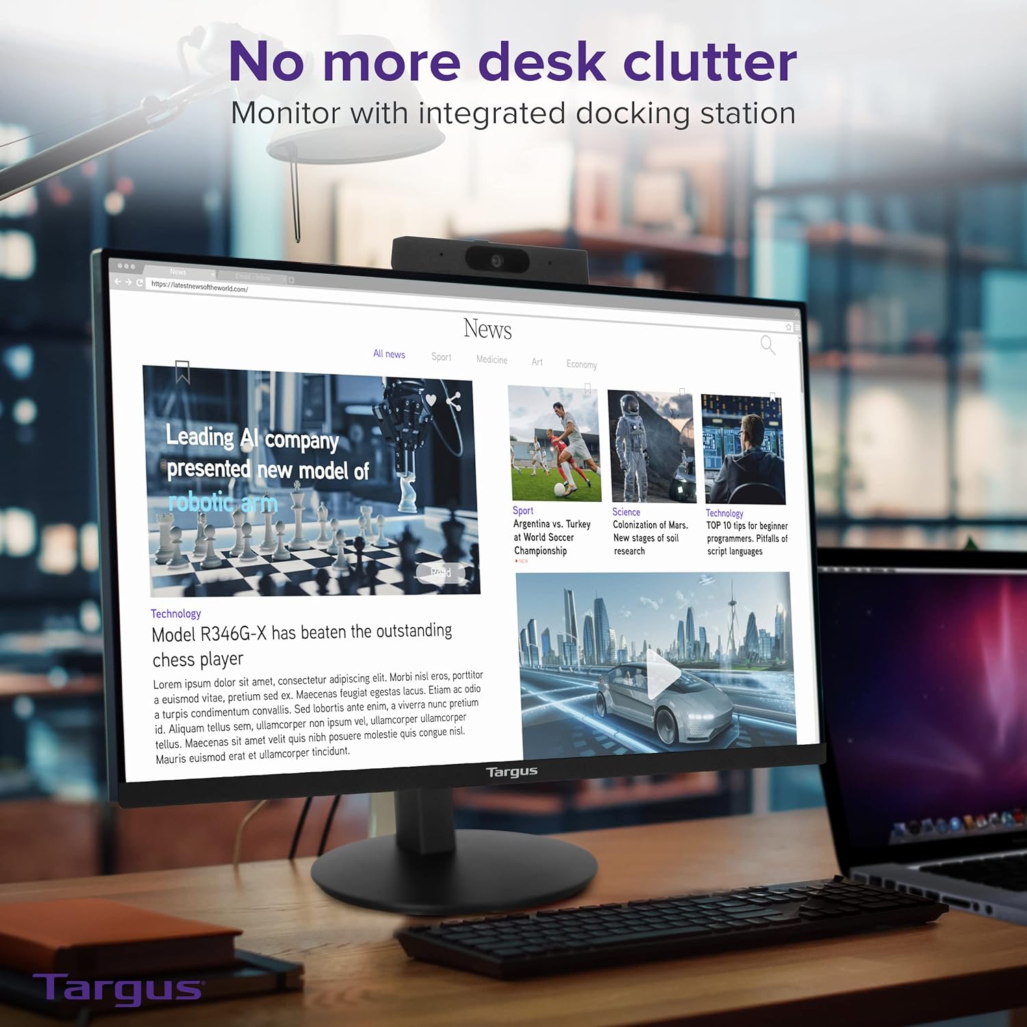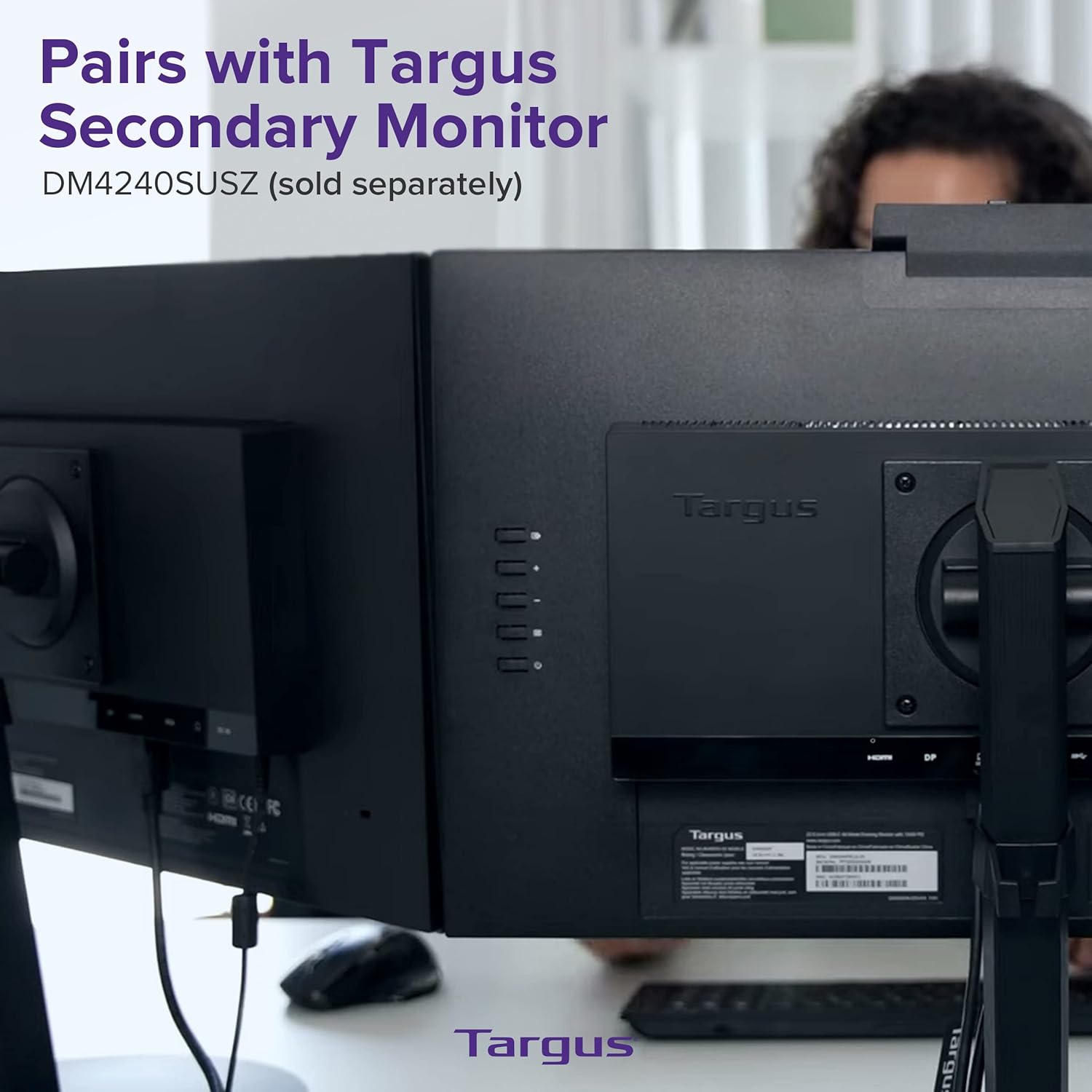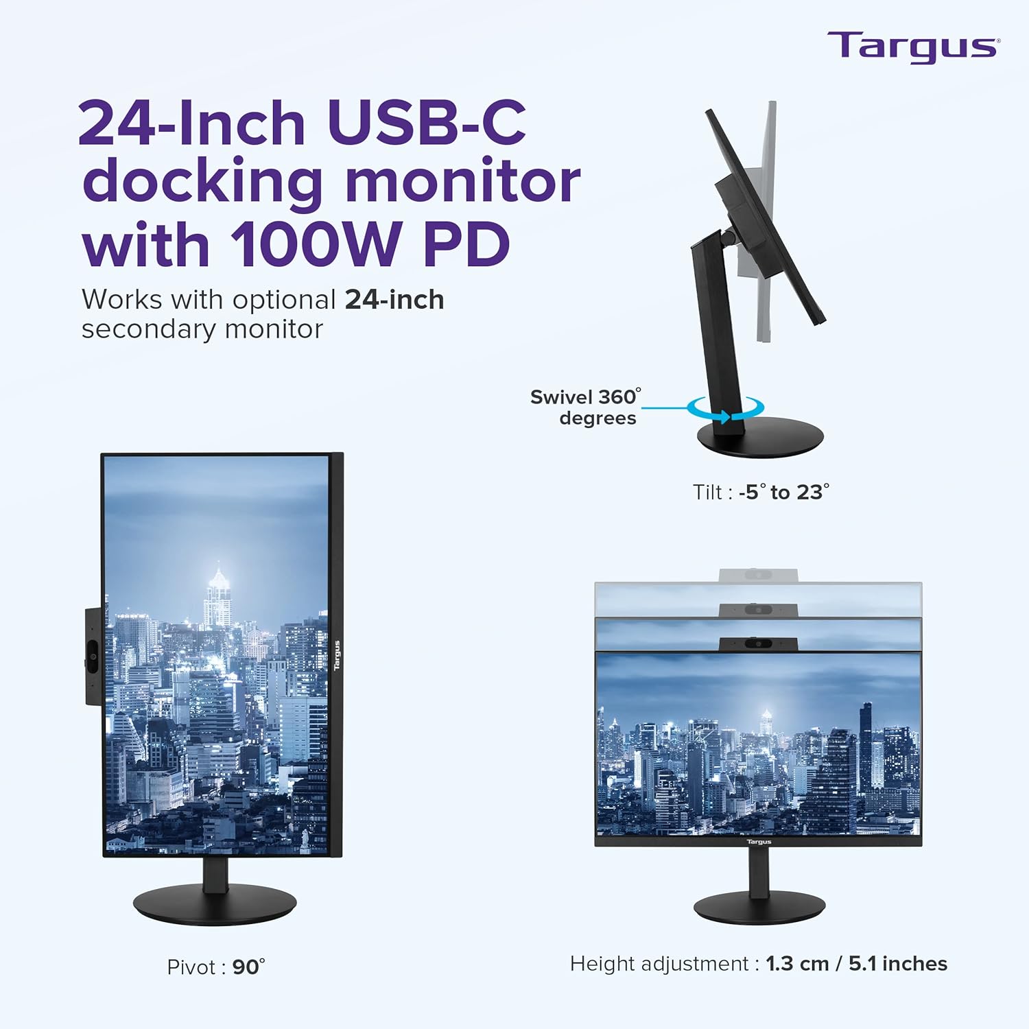 The 24-inch USB-C Docking Monitor with 100W Power Delivery seamlessly incorporates an ultra-compatible Targus docking station into a 24-inch LCD display to create a clutter-free workspace. Equipped with high-resolution graphics and multiple ports, this docking display is designed for productive professionals and offers compatibility with most laptop brands. It features adjustable height, screen tilt angle, 360-degree rotation, and portrait/landscape mode. You will love being able to have a horizontal and vertical monitor. No need to worry about messy cables and extra devices; Save valuable desktop space with the display's built-in speakers, two microphones, and a 2M pixel webcam. Connect other essential workspace peripherals, like your mouse, keyboard, or favorite external hard drive, to one of its 2 USB-A 3.2 Gen 1 ports. Add to that a 100W power supply and display design comfortable, the DM4240PUSZ is the ultimate foundation to keep you connected, powered and productive. Do you need more display space? This docking station is equipped to easily daisy-chain additional video and power to a Targus secondary monitor (DM4240SUSZ sold separately). Our bases work with Mac and PC platforms, as well as Chrome OS, Android and Linux. This broad compatibility supports flexible work applications, such as hotels and hot desking, and provides a future-proof solution that eliminates the need for replacement each time the laptop is upgraded. A single USB cable easily expands workstations with the addition of multiple displays and your favorite peripherals. So there's no need to plug in accessories every time you come and go from your desk. Universal docking stations help free up desk space and keep cables tangle-free.