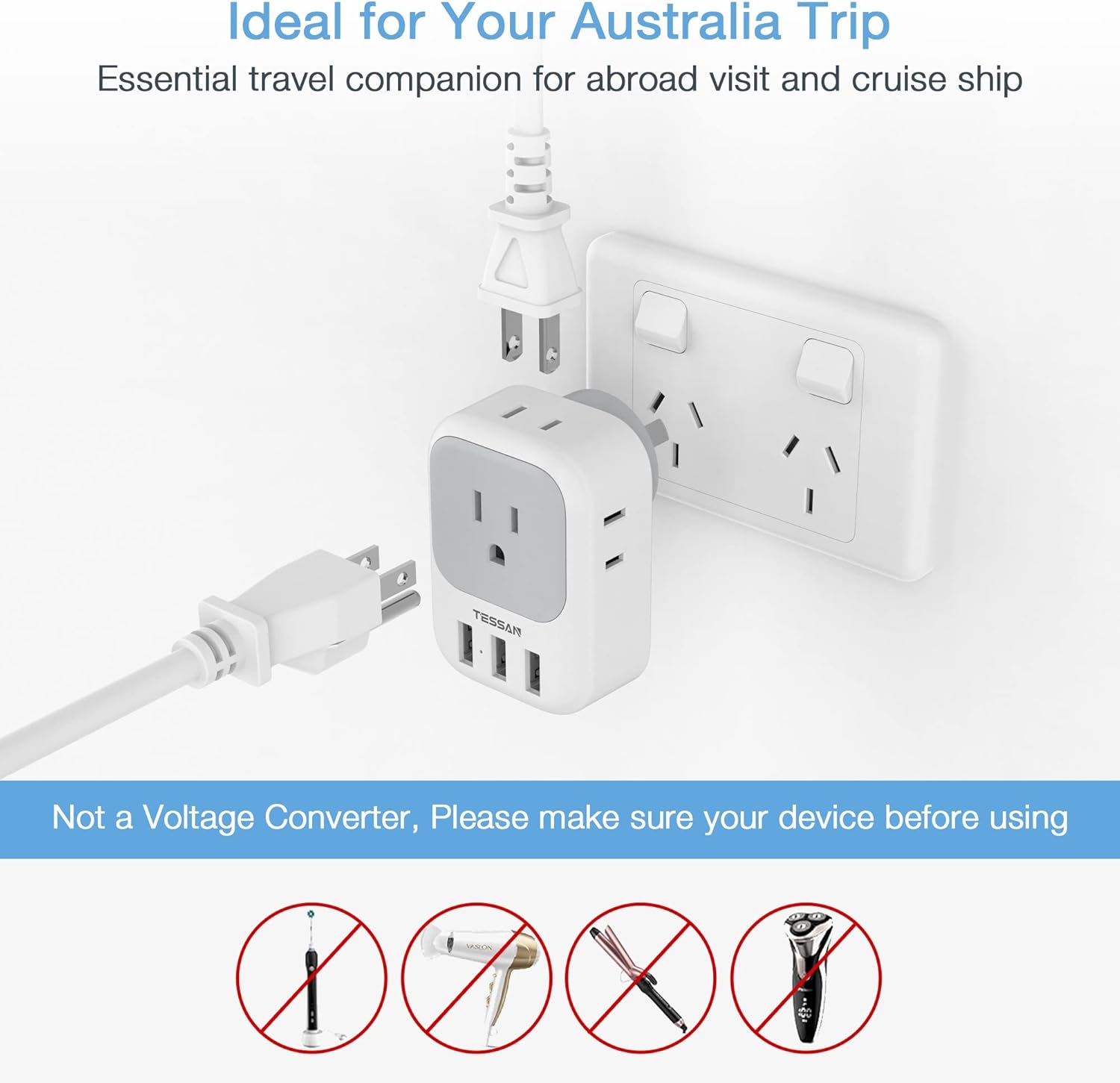 Note: TESSAN Australian power adapter is not a voltage converter. It only works on wide voltage devices from 100V to 250V. If you want to use your hair dryer, straightener or curling iron, these must support wide voltage or you may need a voltage converter.