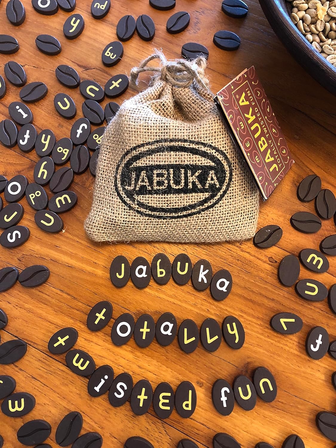 ✅ FAST TRACK BOARD GAME: Jabuka is a fast speed board game for all ages. Similar to scrabble and bananagrams, but with a completely new dimension. Twist the coffee bean-shaped wooden pieces to form different letters and words. Perfect mornings at the coffee shop, game nights for couples, teens, families and parties.