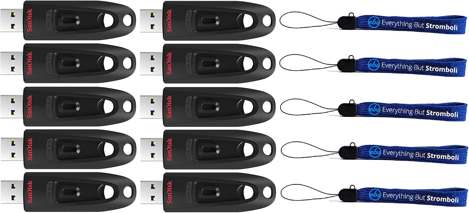 Bundle includes (10) SanDisk Ultra USB 3.0 512GB Flash Drives and (5) Everything But Stromboli Wrist, Keychain or Keychain Lanyards.