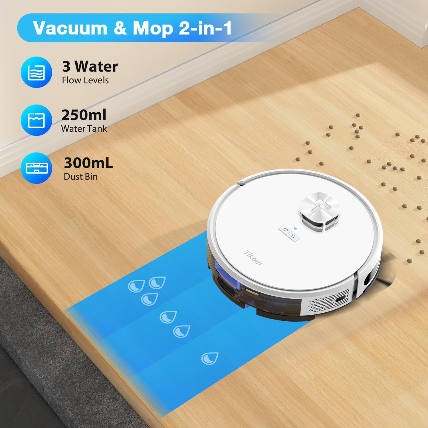 [2 in 1 Sweeping & Mopping]: L9000 robot vacuum cleaner and mop combo adopts the latest mopping technology, equipped with an electronically controlled water pump and 3-level adjustable water outlet, you can enjoy a completely clean home. (Dust tank: 300ML, water tank: 250ML)
