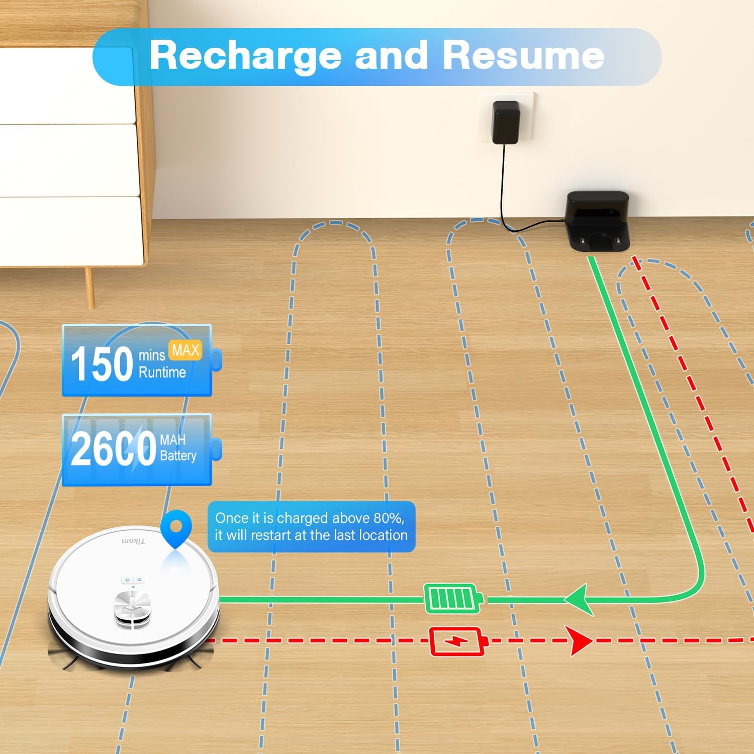 [150Mins Runtime & Self-Charging]: Larger battery capacity can support 150 minutes in silent mode, set multiple protections for the battery to ensure the product is safe and will automatically return to the charging station once the battery is low.