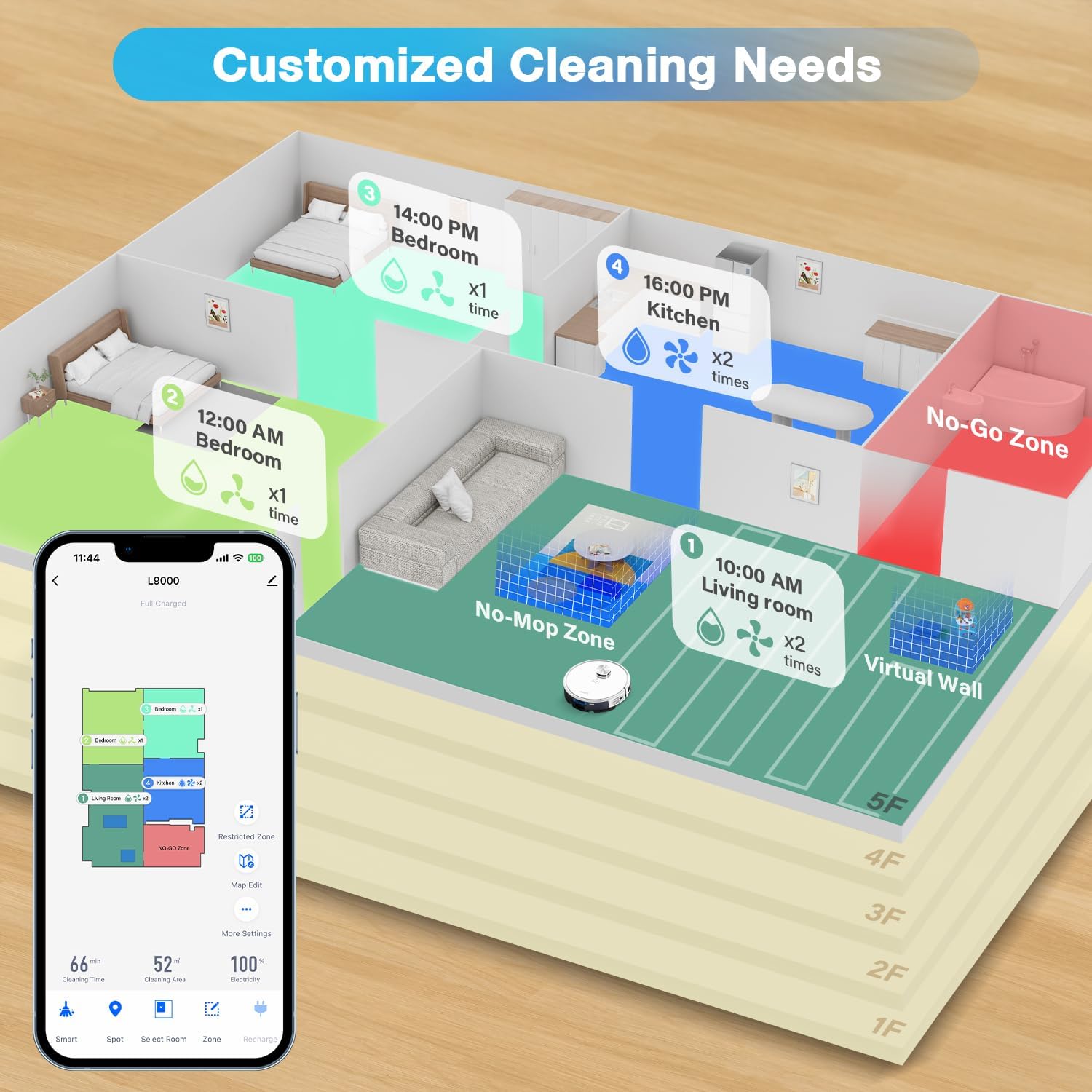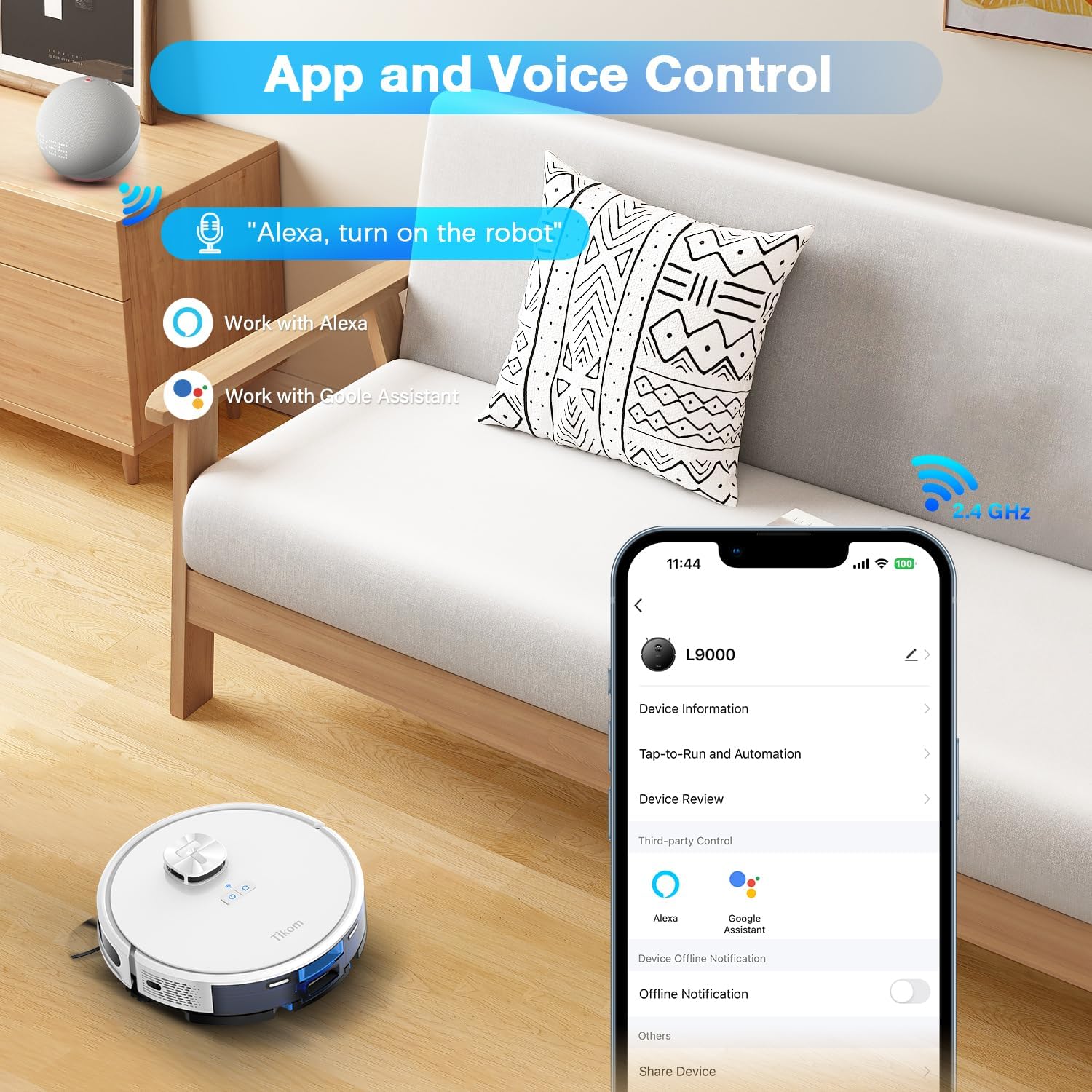[Convenient APP/Voice Control]: Customize your cleaning through the Tuya Smart app by selecting cleaning modes, changing the suction level/water output, cleaning certain rooms, setting a virtual wall, and placing a no-go zone. It can also connect to Alexa and Google Home (only supports 2.4Ghz Wi-Fi).