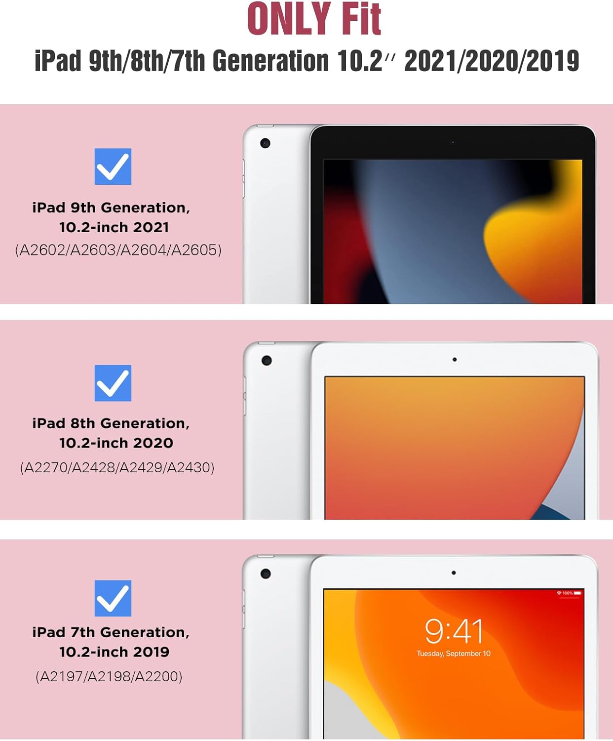 Compatibility: Specially designed for iPad 10.2 inch 9th Generation 2021 (Model Number: A2602 A2603 A2604 A2605) / iPad 8th Generation 2020 (Model Number: A2270 A2428 A2429 A2430) / iPad 7th Generation 2019 (Model Number: A2197 A2198 A2200)