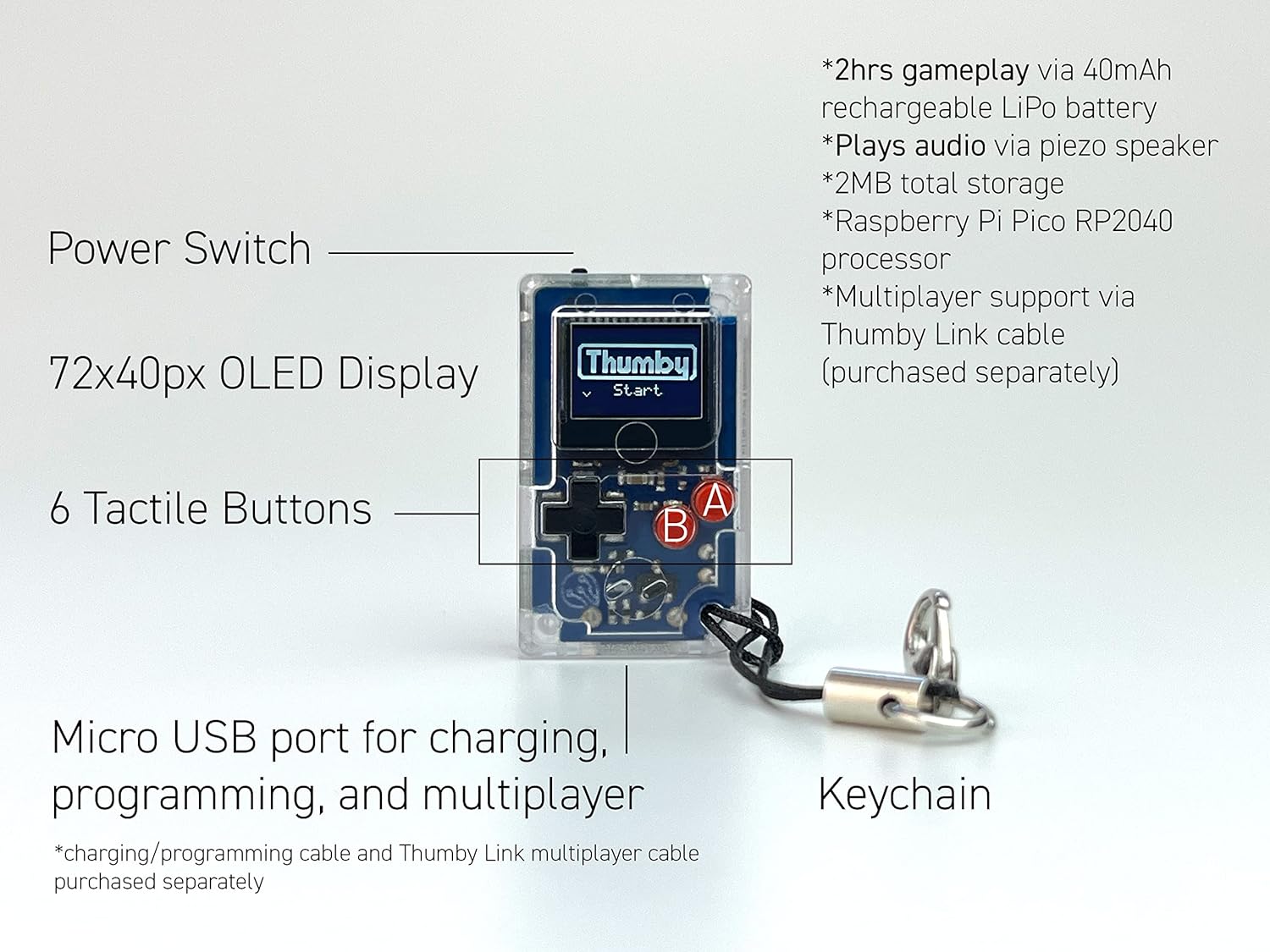 SOLO/MULTIPLAYER: Play solo or against friends with the Thumby Link cable (purchased separately)