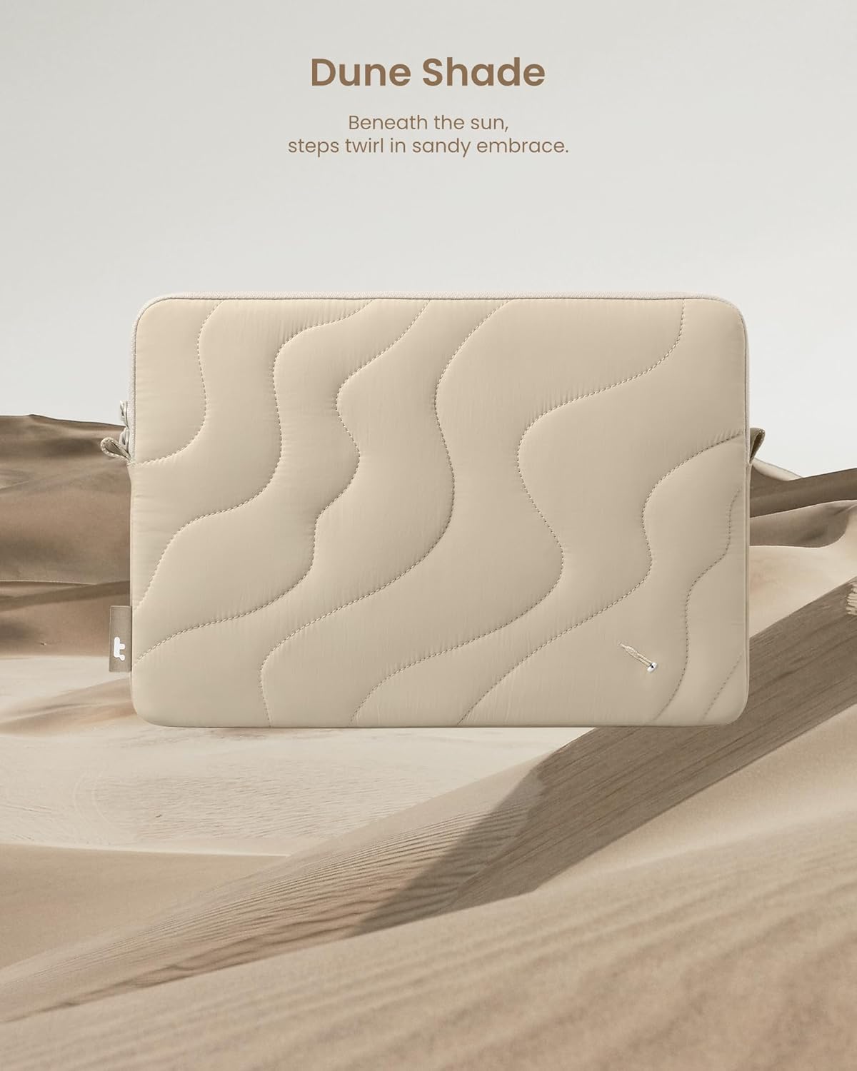 Terra Elegance: Made from recycled materials, this swelling laptop sleeve combines elegance with sustainability. Its distinctive contour line design creates a timeless aesthetic, perfectly adapted to embrace your precious MacBook