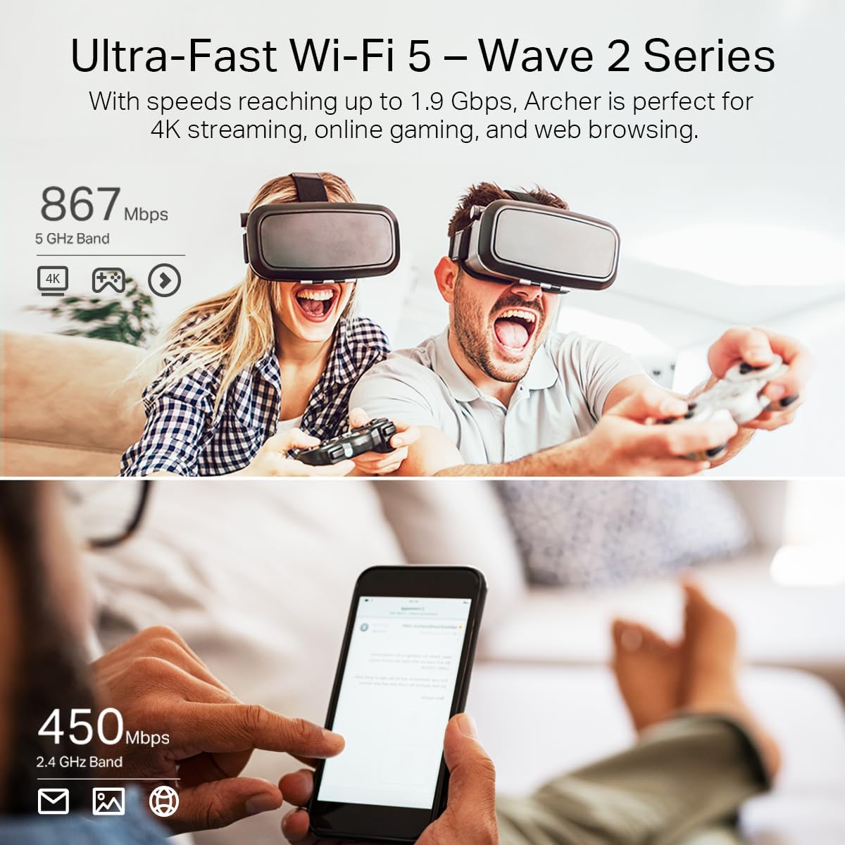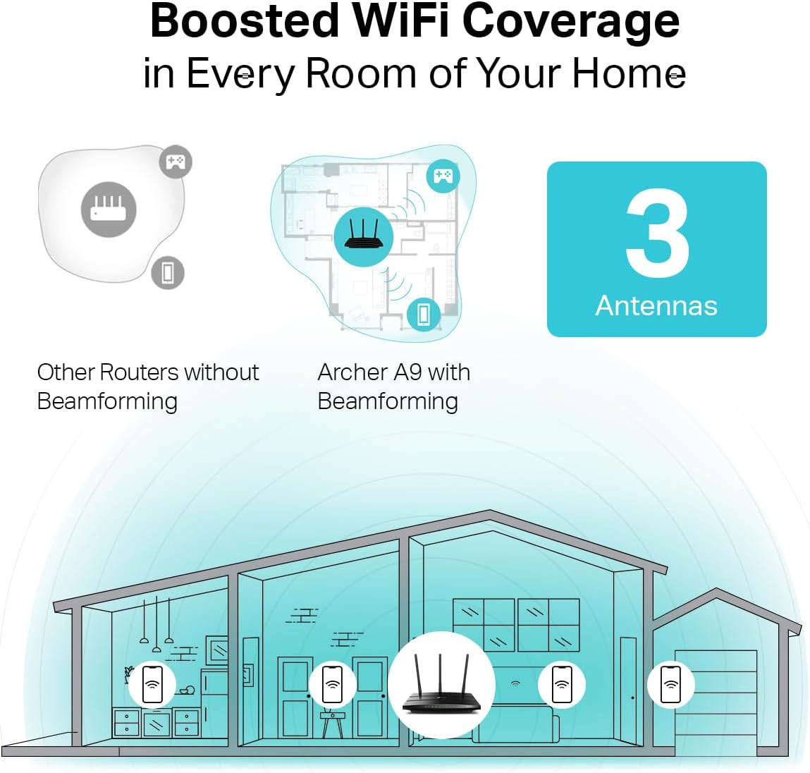 Enhanced WiFi Coverage, Beamforming technology delivers highly efficient wireless connection and long-range WiFi.