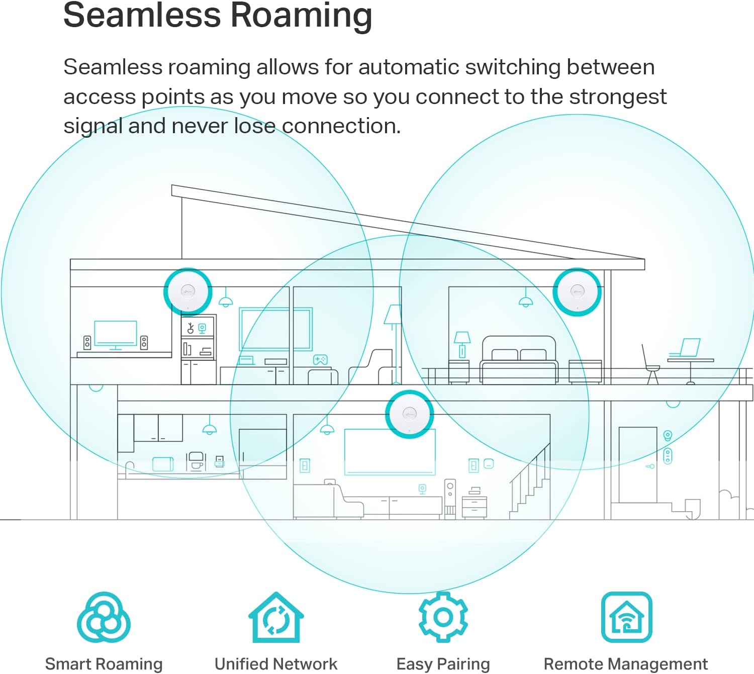 : Supports mesh WiFi, seamless roaming*(Omada Mesh and Seamless Roaming require use of Omada SDN controllers), WPA3, Band Steering, Load Balancing, Airtime Fairness, and Beamforming technologies.