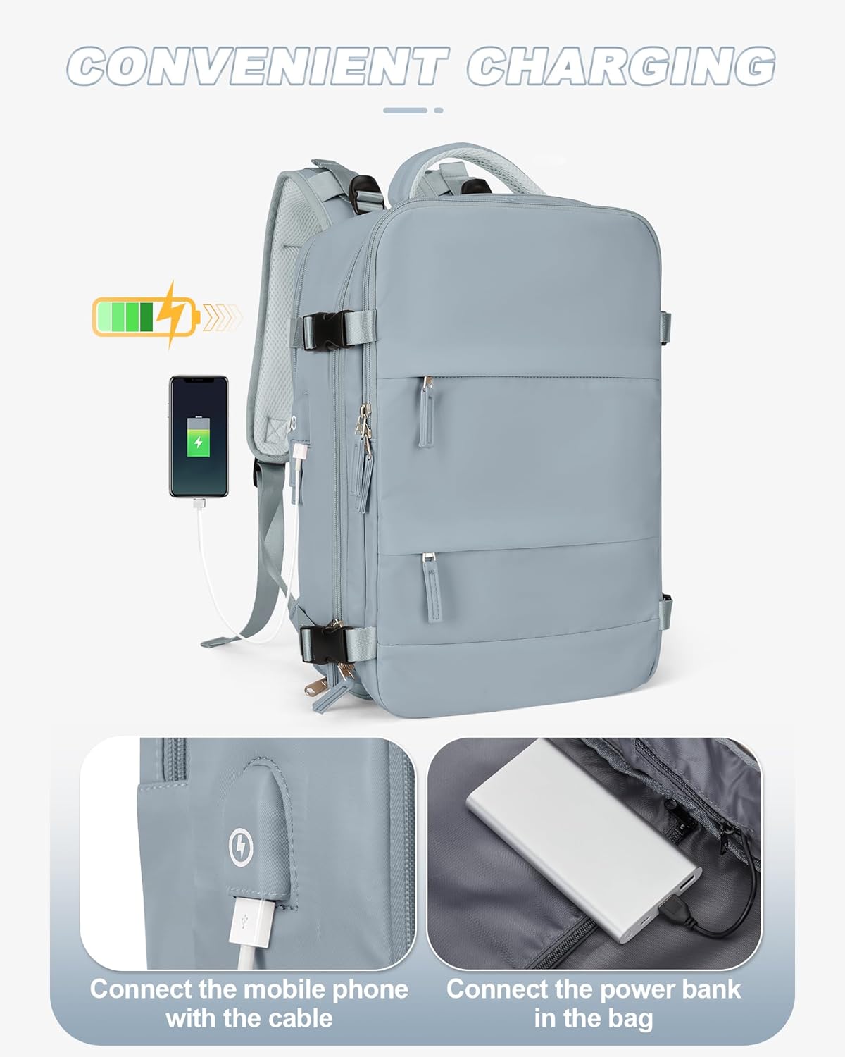 【USB Charging Port】This charging backpack features a USB connection cable, allowing you to connect a power bank inside the backpack. The external USB charging cable can be connected to your phone, allowing you to use your phone on the go without the worry of running out of battery. Please note that this backpack with a USB charging port only provides the USB connection cable, the USB charging cable and power bank need to be purchased separately.