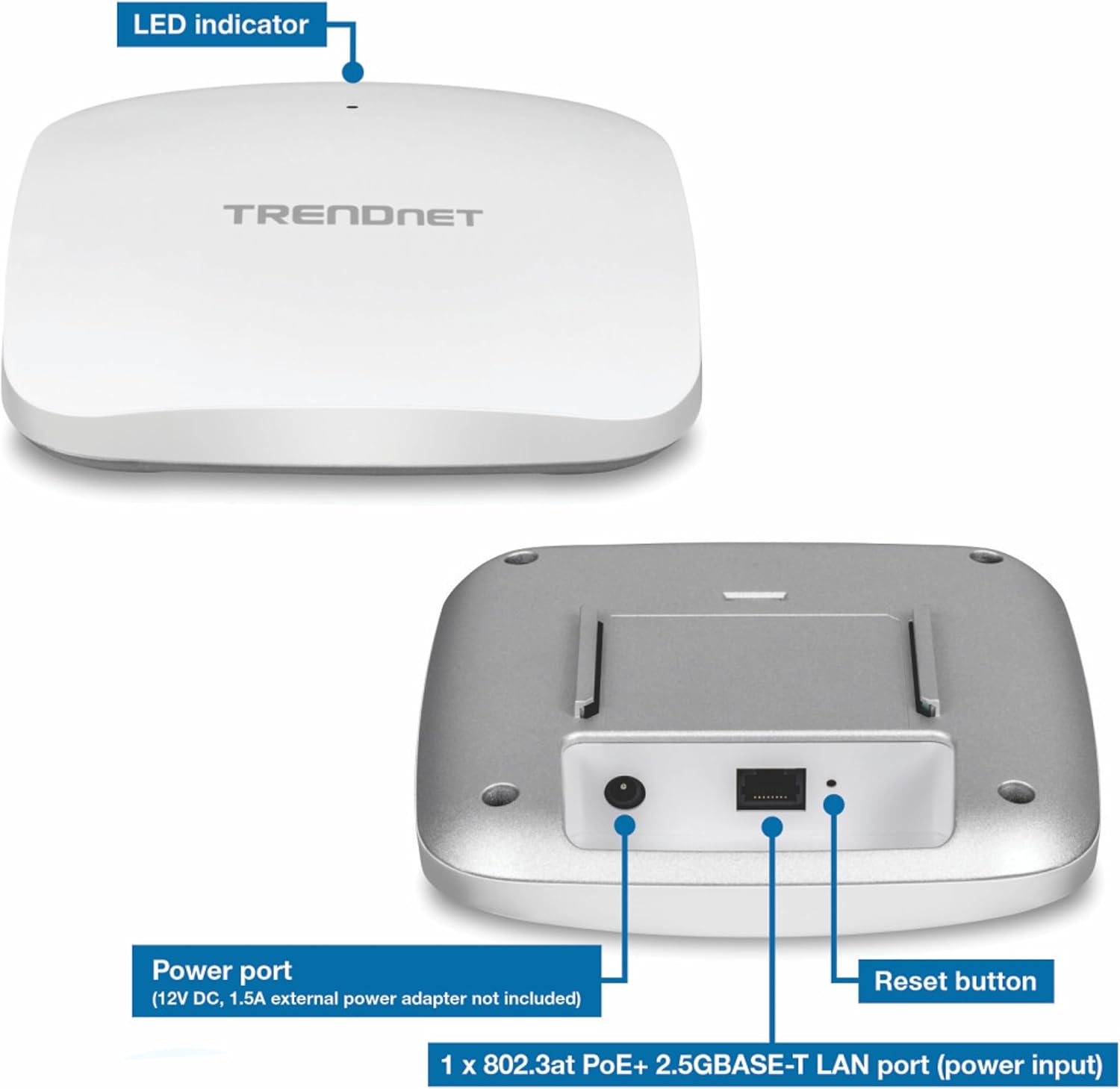 Device interface: 1 x 802.3at poe+ 2.5gbase-t poe+ lan port (food input); Food port (12v DC, external power adapter 1a not included); LED indicator; Restart button adapter not included); LED indicator; Restart button