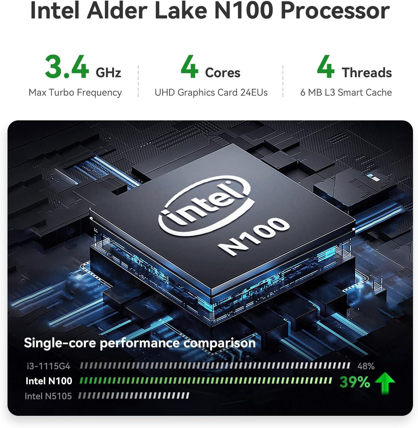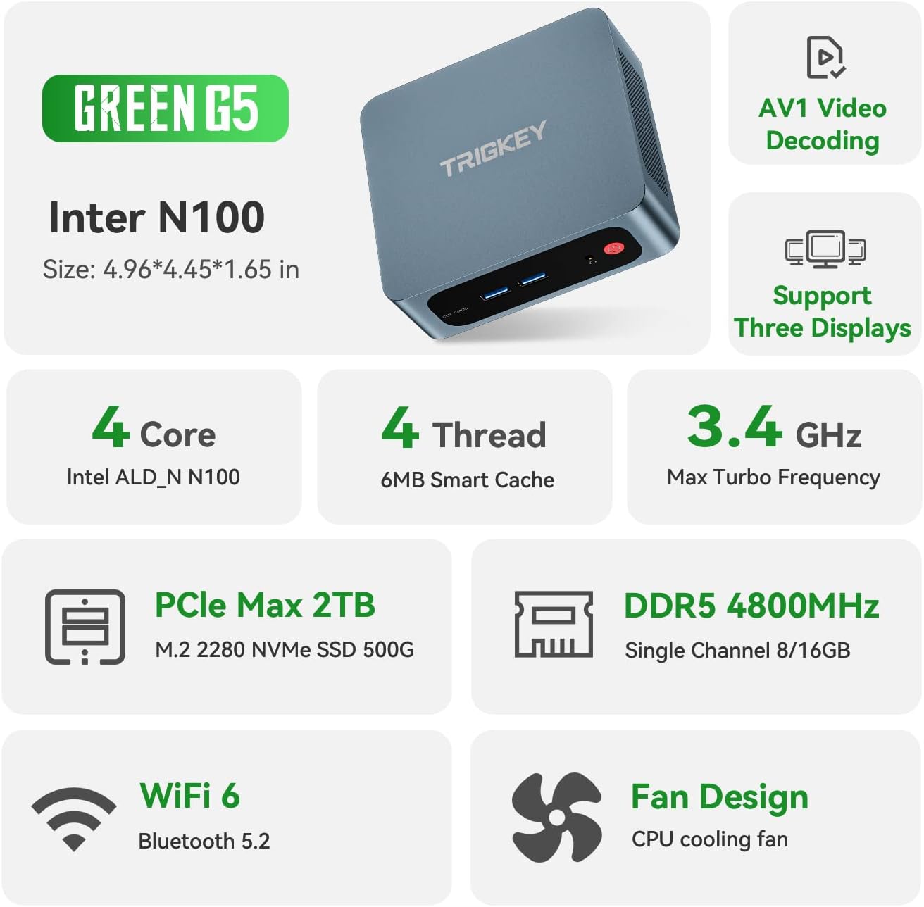 High-Speed Intel 12th Generation N100 Processor: TRIGKEY G5 mini PC is equipped with AMD Intel 12th N100 (3.4GHz turbo frequency, 4 cores and 4 threads). At present, most CPUs on the market are secondary smart caches, while the G3 Mini PC is a third-level smart cache L1 384 KB L2 2 MB L3 4 MB. When processing programs, up to 90% of programs can be processed directly on the CPU without going through RAM, which greatly improves work efficiency and makes it easier to handle various complex tasks.