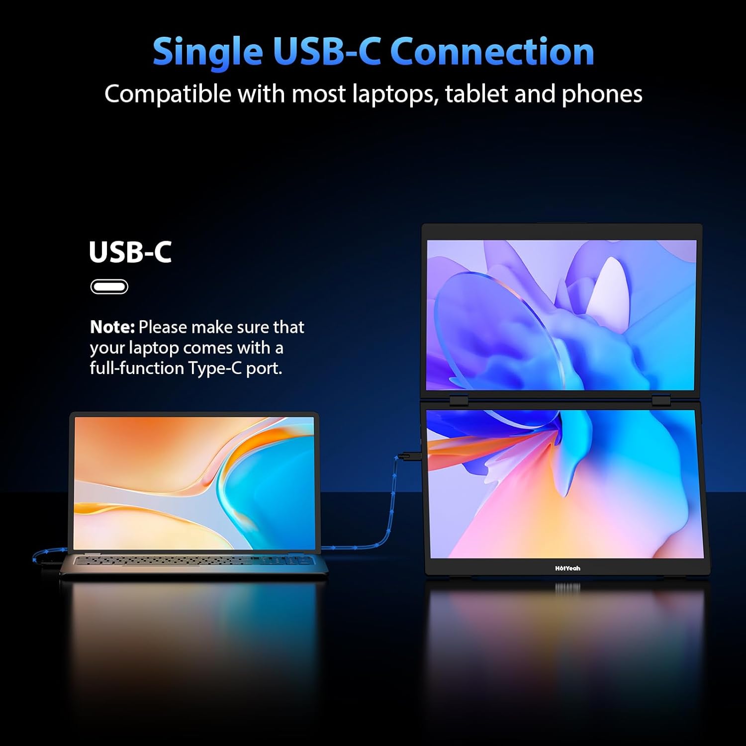 ▶️True Plug And Play- No driver or app is needed and no complex setup is required. HotYeah portable monitor features 2 full-function USB Type-C ports. It works well with most Wins system laptops, tablets, and some smartphones. With one USB-C cable, you can control both screens at the same time. Say goodbye to cable clutter and say hi to seamless efficient work anywhere. Note: For phone and tablet, it only supports mirror mode.