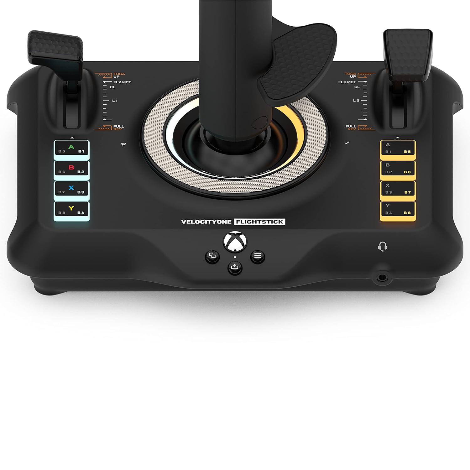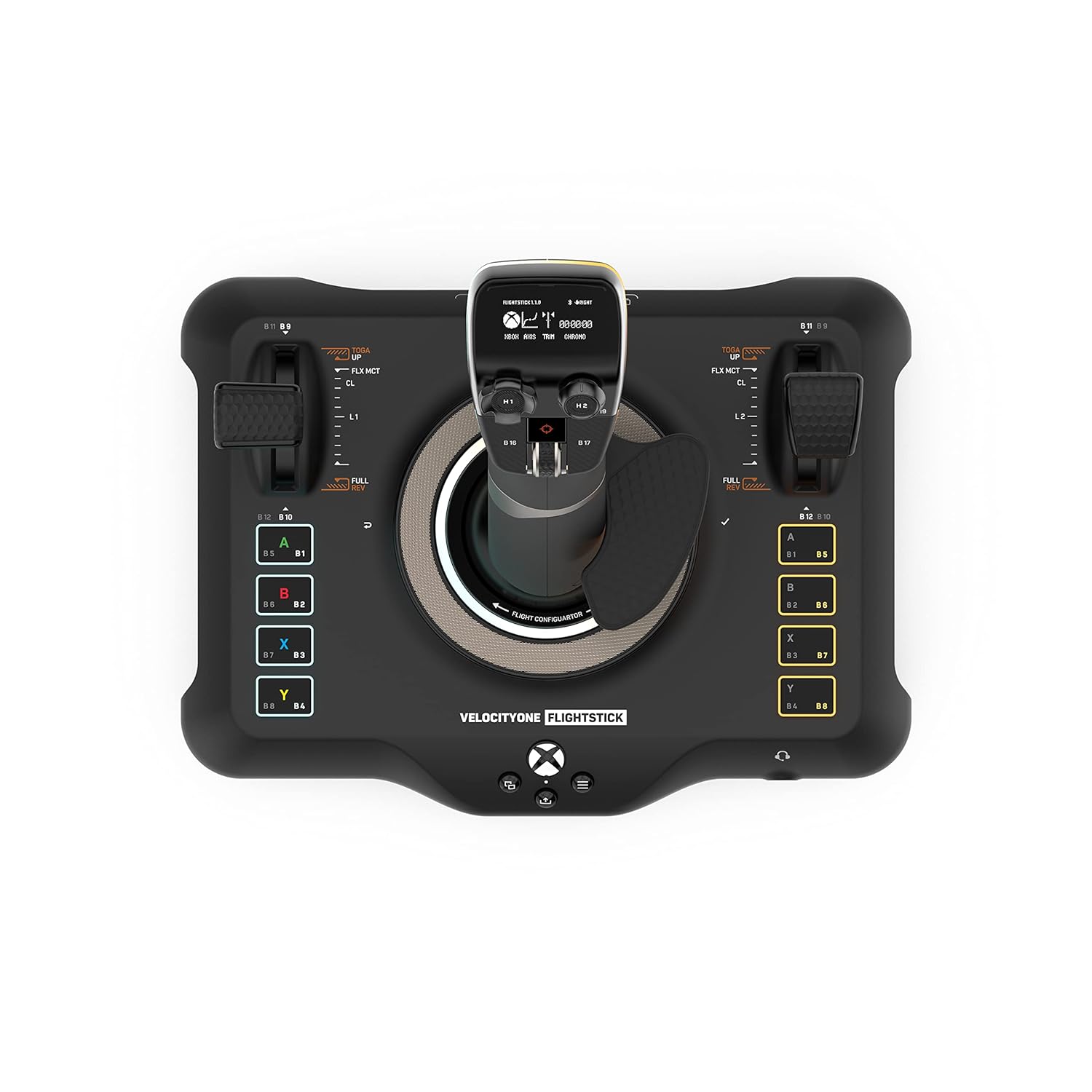 Turtle Beach VelocityOne Flightstick for Xbox Series High-resolution non-contact sensors provide precise response and greater longevity to the primary controls, while the throttle and flap levers control the power of the main engine and allow quick adjustment of secondary control surfaces. Additionally, the sticks can be customized with interchangeable throttle heads to fit the aircraft you are flying. Precision detents in the minimum and maximum positions allow activation of full reverse thrust at minimum and afterburner, boost or takeoff/spin thrust at maximum. An ultra-precise nano trim wheel allows fine adjustment of attitude, and an analog POV hat allows free peering into cockpit views or strafing thrusters in space simulation games. An OLED flight management display makes it easy to adjust control profiles, trim wheel input mode, rudder lock, and more. Navigate the FMD using an intuitive one-click rotary dial on the base of the device to configure and update product performance in real time with all information stored in the onboard memory. 27 programmable buttons, including an 8-way digital POV hat, rapid fire trigger, stick-mounted buttons, dual throttle stick detents, and 8 programmable base buttons equip you with an arsenal of adjustable controls for your most critical simulation functions. . Pilot fighter jets or airliners thanks to an ambidextrous right- and left-handed design with a reversible palm rest and programmable base buttons that allow all settings to be configured for right- or left-handed controls. Take customization a step further and adjust the color, brightness and response of multiple RGB LED zones. Familiar Xbox controls allow for easy console operation, and you can switch input mode to PC to play a wide range of simulation titles. Additionally, the Flightstick can be used in conjunction with Turtle Beach's VelocityOne rudder pedals on PC and Xbox*, for an even more immersive flight experience.